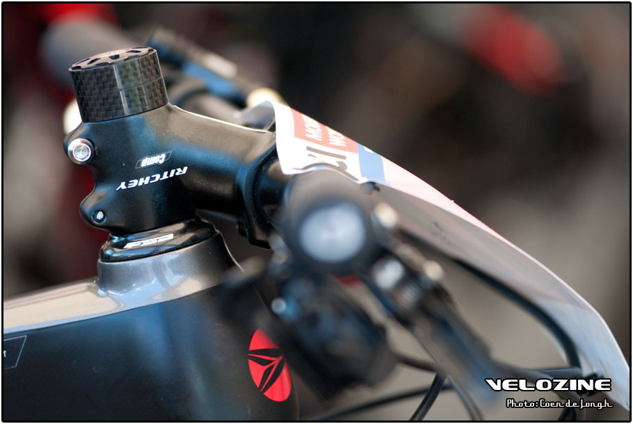 Dit lijkt niets bijzonders… maar is een 1 1/8 stuurpen (geen Tune of Leonardi volgens de teammanager) op een carbon stuurbuis. Alles voor dat beetje extra gewichtsvoordeel