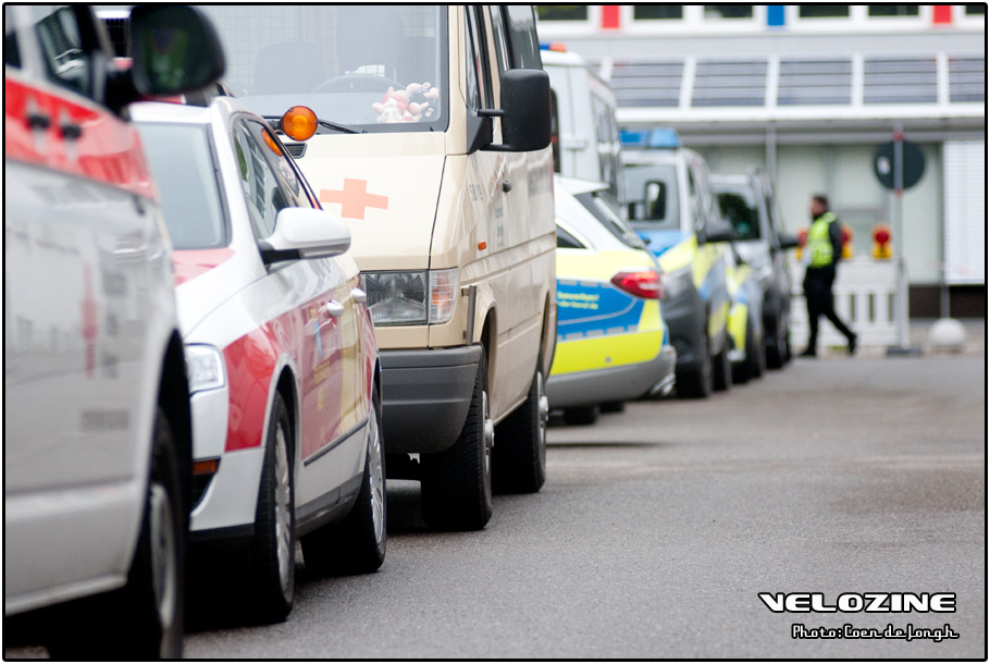 Hoewel het parcours van Albstadt inmiddels zo veilig is, dat je het wel heel bont moet maken om te vallen, laat het Rode Kruis middels de ochtendbriefing niets aan het toeval over.