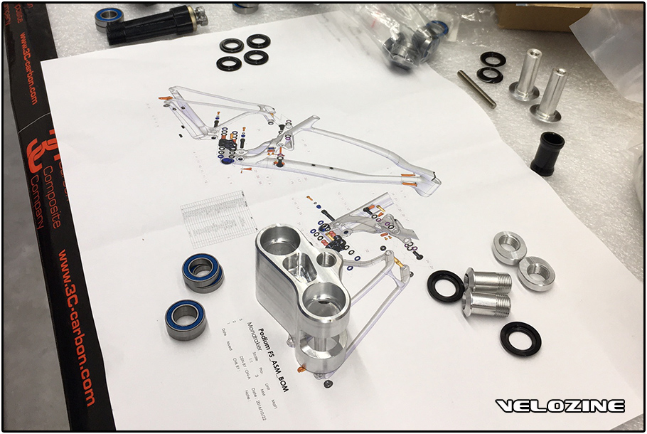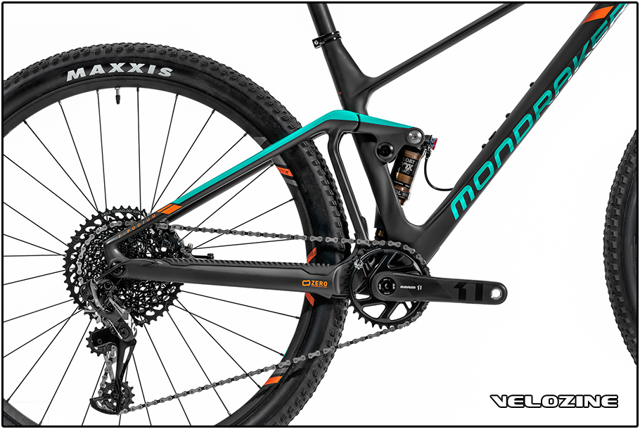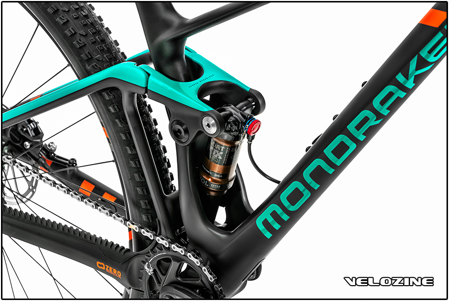 Het veersysteem van het frame is gebaseerd op het ‘Zero’ concept dat Mondraker ook toepast op haar dikkere Dune, Foxy en Summum full suspensions. Voor de F-Podium is dit concept uiteraard meer toegespitst op het gebruik op de veeleisende cross country wereldbekerparcoursen en is dus niet overdreven gretig met het aanspreken van de 100 mm beschikbare veerweg tijdens het trappen. Trapefficiency is het sleutelwoord. In de kern is het nog altijd een systeem met een virtual pivot, ontstaan door de twee hevels die de achtervork met het voorframe verbinden. De bovenste link is volledig uit carbon vervaardigd en is verbonden met een demper met een trunnion bevestiging. Die demper loopt vervolgens door een tunnel in de zitbuis om vervolgens aan de aluminium hevel boven de trapas bevestigd te worden. Het staat Mondraker toe om de krachten van het veersysteem meer te isoleren rond de zitbuis, waardoor het frame op andere plekken lichter kan worden gemaakt.