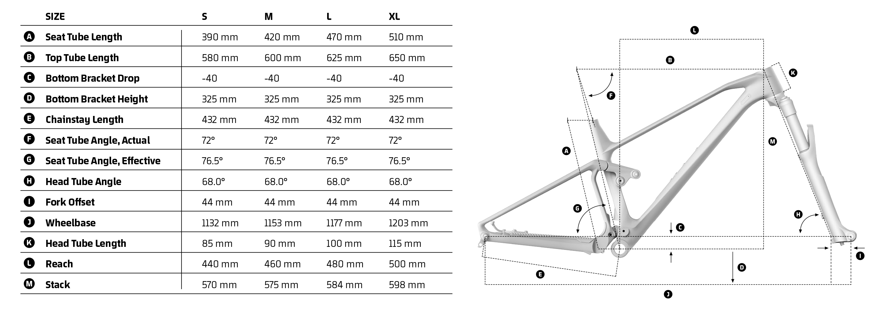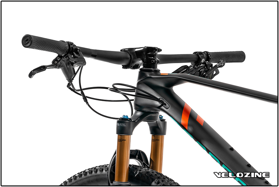 Dat wordt ook verder bevestigd als we naar de geometrietabel kijken. De voorvork staat namelijk onder een hoek van 68 graden (de vork offset bedraagt daarbij een korte 44 mm), wat tot voor kort enkel denkbaar was bij fietsen met veel meer veerweg. De wielbasis is erg lang. Als voorbeeld heeft framemaat ’S’ een wielbasis die bij veel merken pas in beeld komt bij 2 framematen groter. Om die lengte te compenseren is de zithoek dus steil, 76,5 graden om specifieker te zijn. Hadden we al gezegd dat de stuurpennen kort zijn? Bij de kleinste framematen meet die slechts 50 mm… Op die manier pas je toch op een fiets die qua frame langer is dan de gemiddelde andere fiets in jouw maat.