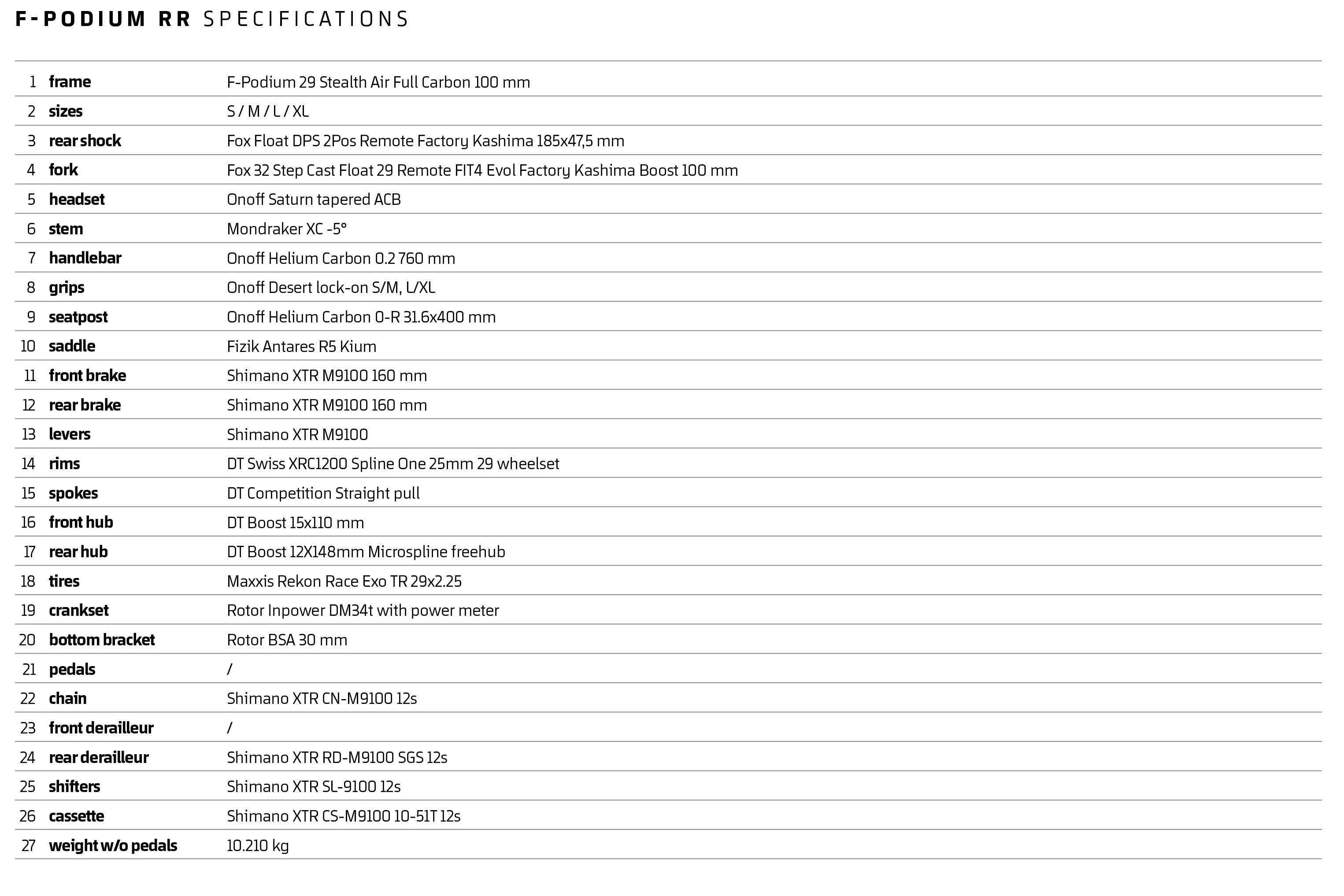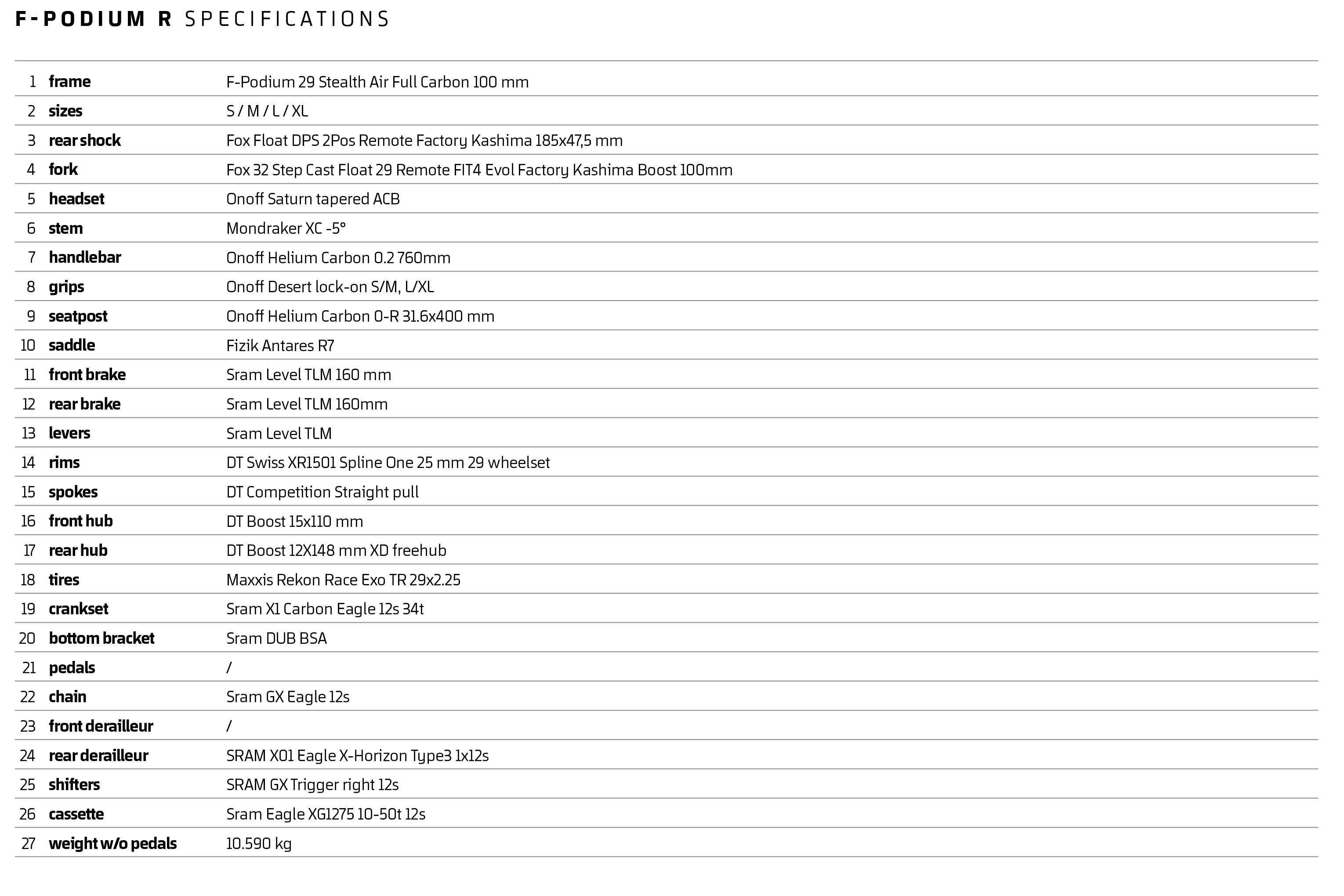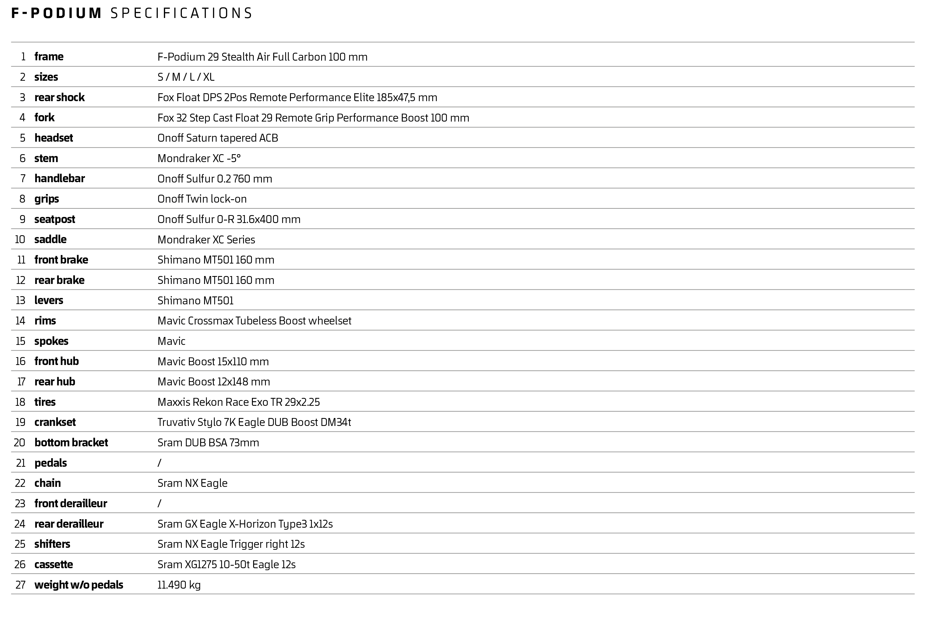 Dat Mondraker aan iets werkte, was niet echt een geheim. Gedurende de voorbije twee Wereldbekerseizoenen waren er diverse prototypen tussen de linten te zien. Nu trekt het merk het doek er vanaf lanceert de F-Podium 29er met 100 mm veerweg voor- en achteraan in vier modelvarianten. Mondraker zocht al in 2015 contact met een Duitse carbonspecialisten van 3C Carbon die hun sporen in de automotive (onder meer Formule 1 en DTM) én fietsindustrie verdiend hebben. Samen trokken ze op om het concept van Mondraker’s Forward Geometry te combineren met de laatste technieken op het gebied van carbon, met als doel om één van de lichtste racefullies op de markt te realiseren.