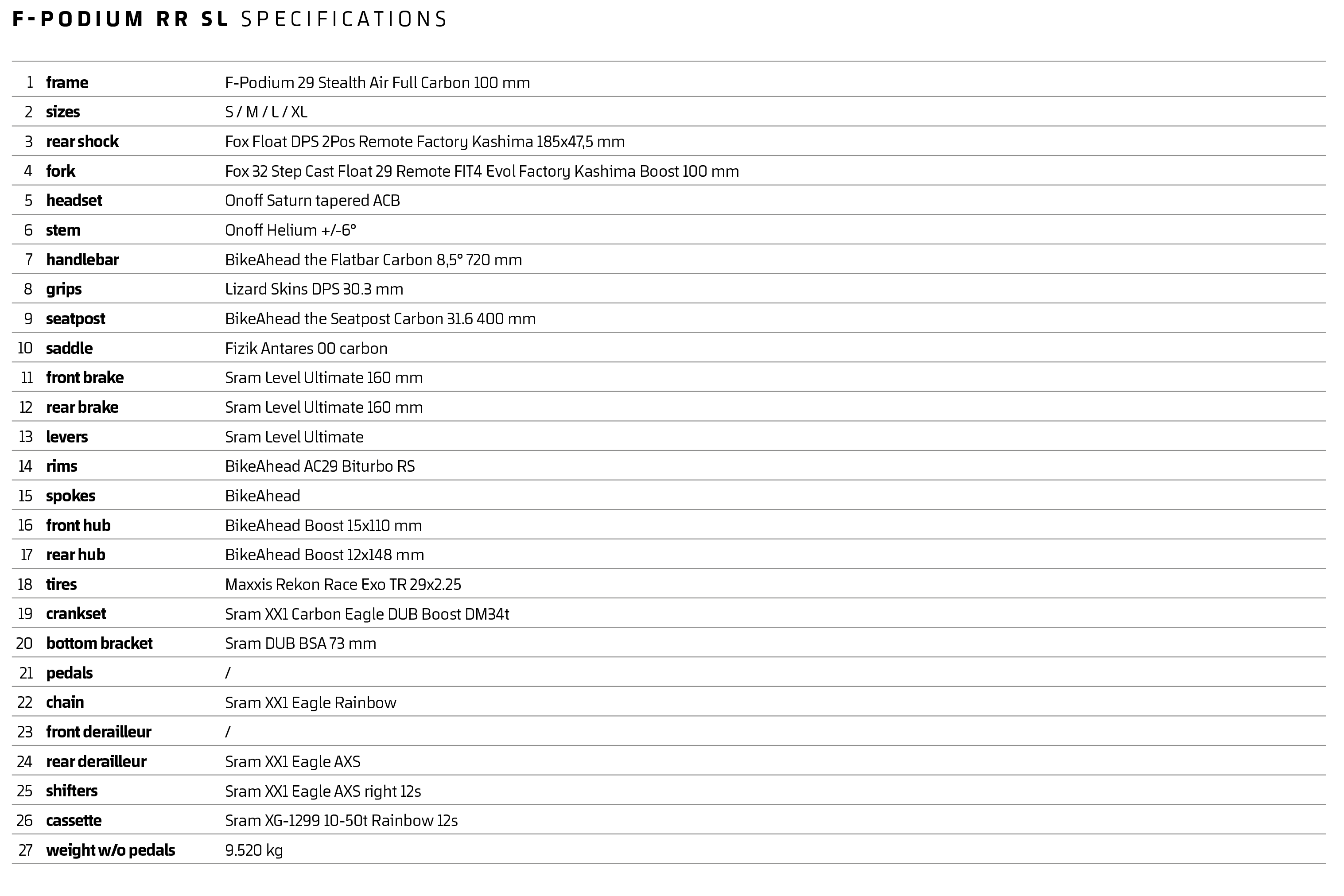 De F-Podium is per direct leverbaar met vier afmontages. De prijs het topmodel, de RR SL, is nog niet bekend. Maar zoals vaak zal de prijs omgekeerd evenredig stijgen met het afnemen van het gewicht. Met die aanname, zal de 9,5 kg wegende RR SL waarschijnlijk astronomisch zijn. Zeker gezien het feit dat die fiets uitgevoerd is met carbon onderdelen van die andere Duitse carbonfirma Bike Ahead Composites en SRAM’s draadloze schakelgroepset. Van de F-Podium RR wordt ook een losse frameset leverbaar, maar ook daar is nog geen prijs van medegedeeld.
