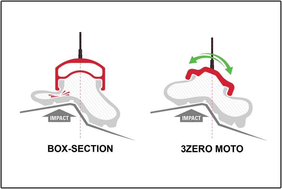 We hebben zelf nog niet de gelegenheid gehad ermee te rijden, maar dé USP van de 3Zero Moto-wielen zou zijn dat de velg door z’n specifieke constructie iets kan ‘meebuigen’ met de ondergrond, waardoor niet alleen meer grip en controle gerealiseerd zouden worden, maar ook de wangen van de band ter hoogte van de velgrand bij een harde impact minder belast worden, wat het risico op snake-bite zou doen afnemen.