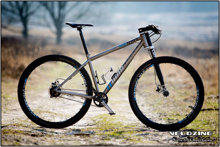 De fiets waar wij mee op pad waren, de Antilope, is de 29 inch XC/Marathon fiets van de collectie. Nu wilde ik mijn verhaal vervolgen met “Het eerste wat opvalt…”, maar dat klopt niet. Er valt namelijk vanalles tegelijk op aan de fiets. Allereerst is er de Cannondale Lefty XLR voorvork, een opvallende keuze in een niet Cannondale frame. Het achterwiel is opgebouwd op een Rohloff achternaaf, mij wel bekend van alle vakantiefietsen die ik in een vorig leven heb opgebouwd, maar die ik buiten de gebruikelijke Santos of Idworx creaties nog amper op andere fietsen terugzie. Voor de aandrijving van dat achterwiel zorgt een Gates carbon drive riem in plaats van een ketting. Het is dat de fiets gewoon Racing Ralph banden en een breed stuur heeft, anders had ik hem niet eens als mountainbike herkend!