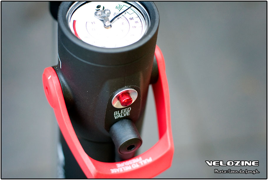 Het werkt eigenlijk heel eenvoudig: op de pomp zit een grote hendel die de afvoer van de hogedrukkamer afsluit als je deze naar beneden plaatst. Dan kun je gaan pompen totdat de druk hoog genoeg is (ergens rond de 160 psi voldeed in al onze pogingen). Vervolgens plaats je het ventiel van de pomp (zowel voor frans- als autoventiel) op je tubeless ventiel, je trekt de rode hendel naar boven en voila, vanuit de hogedrukkamer stroomt er genoeg lucht naar je band om deze in een keer dicht te krijgen.