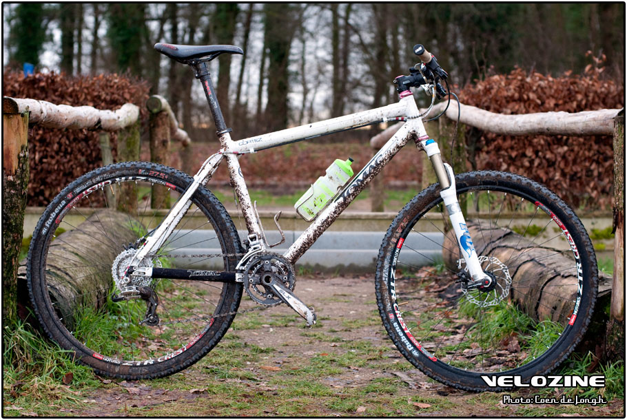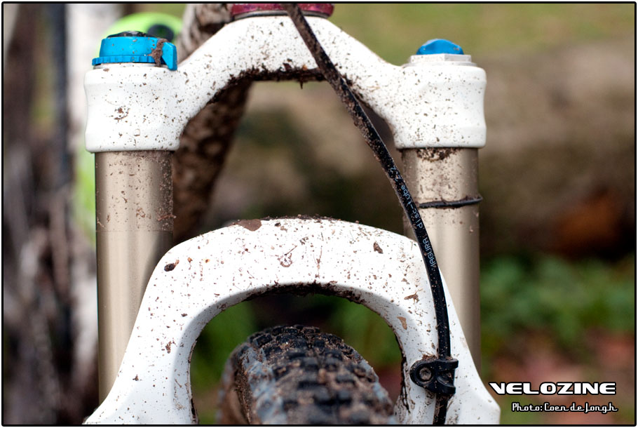 Hoe het ook zei, Velozine moest nodig aan de 650b! The proof of the pudding is in the eating! Wielset overlaten komen van die firma uit Big Flats, en monteren in mijn eigen, oude trouwe Johnny T branded Cortez. Ja, dat is een 26 inch fiets. En ja, de bottombracket staat daarvan standaard al hoog. En ja, als ik mijn standaard Fox luchtinstelling voor de voorvork gebruik (veel sag), dan is het risico aanwezig dat het voorwiel (met Schwalbe 2.25 Racing Ralph) de onderkant van de vorkkroon raakt. Hmm, dat wil ik niet, dus veiligheidshalve gaat daar 10 psi meer in dan gewoonlijk.