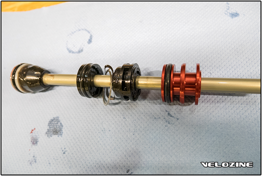 Ik had vooraf óók verwacht dat de DebonAir-zuiger – net als bij de 35 mm vorken – het volume van de negatieve luchtkamer zou vergroten. Dat bleek een misvatting: onderstaande foto toont dat de inbouwhoogte van de oude onderdelen (als je alles op elkaar stapelt) en nieuwe zuiger nagenoeg identiek zijn. Dat betekent ook dat de veercurve met de nieuwe zuiger dus niet verandert, in tegenstelling tot bij de veelgeprezen DebonAir-upgradekit voor Rockshox’ 35 mm vorken. Wat dat betreft kun je bijna zeggen dat de DebonAir-aanduiding een beetje misleidend is.