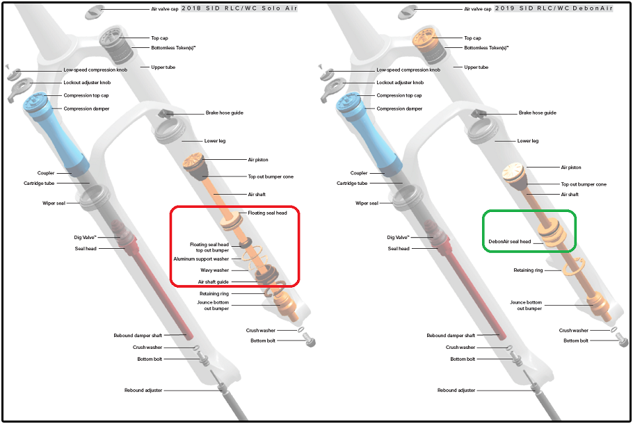 Vanaf 2019 past RockShox een iets andere constructie toe. Deze lijkt eenvoudiger met minder onderdelen. Onderstaande afbeelding illustreert dit. Links (rood omkaderd) de onderdelen die de SID 2018 tot ‘SoloAir’ maken: een zwevende zuiger met twee O-ringen, een top-out bumper, twee metalen ringen en een kunststof geleidebus die onderin de binnenpoten vastzit. Rechts (groen omkaderd) de vereenvoudigde constructie die de RockShox SID 2019 tot ‘DebonAir’ maakt: de DebonAir-zuiger is een aluminium bus met twee O-ringen en een ingeperst glijlager. Vanwege dat glijlager en het ontbreken van de schuivende top-out bumper, heeft de nieuwe constructie – als het goed is – minder wrijving dan de oude, en zou de vork daarom soepeler moeten aanspreken!