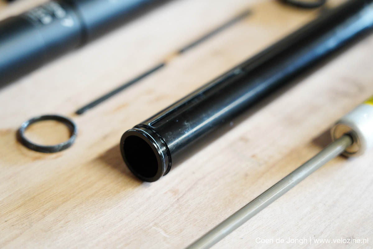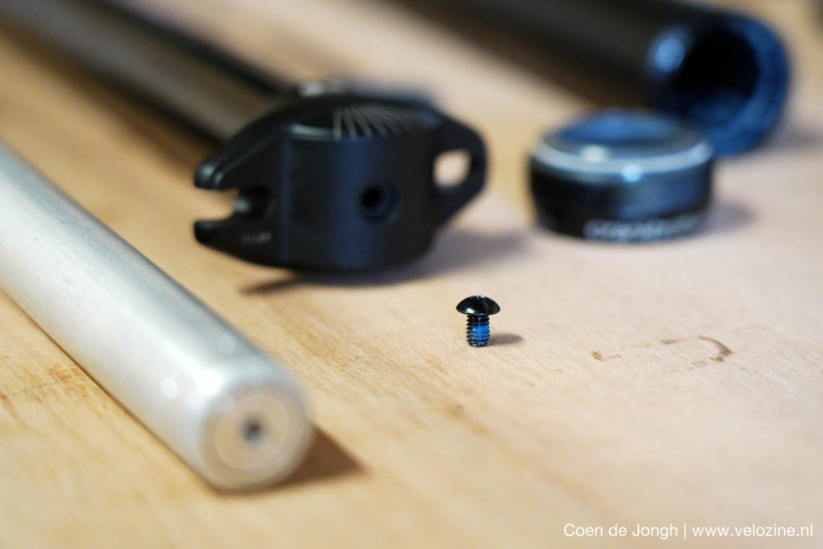 Verder dan dit kregen we de dropper niet uit elkaar zonder iets stuk te maken. Deze onderdelen zijn, afgezien van de remote en kabel, de enige onderdelen van de zadelpen. Voor het uit elkaar halen heb je overigens niet meer nodig dan wat inbussleutels en je eigen handen.