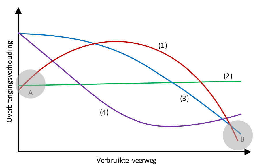 Vering die progressief begint (3 & 4) heeft in het begin een grotere overbrengingsverhouding en gaat daardoor beter om met de originele demper. Voeg hier een Corset aan toe en de achtervering reageert wel héél goed op kleine schokken. Vlakt de overbrengingsverhouding in het midden van de veerweg af (4) dan biedt de Corset daar ook meer stabiliteit. Enkel een (te) sterk progresseif einde (gebied B) blijft behouden. Meer uitvoerige uitleg kan je overigens vinden op de blog van Vorsprung zelf.