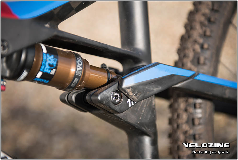 Naast geometrie is natuurlijk ook het veersysteem van belang. Ook dat hebben de constructeurs uit het Beierse Waldershof behoorlijk goed voor elkaar. Zoals bij al hun fullies past Cube een vierpuntssysteem met Horst-link toe, een draaipunt net voor/onder de achteras voor een actieve vering met – in theorie – minimale trapinvloeden. De beweging van de achterbrug wordt via een hevel op de demper overgebracht. Wat overigens niet goed te zien is, want Cube heeft de draaipunten aan weerszijden met een carbon plaatje afgedekt. Echt nut heeft dat plaatje niet trouwens, behalve dan dat het de strakke lijnen die deze bike kenmerken nog wat strakker trekt.