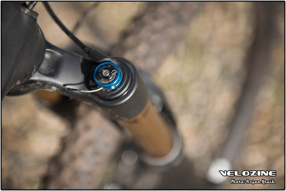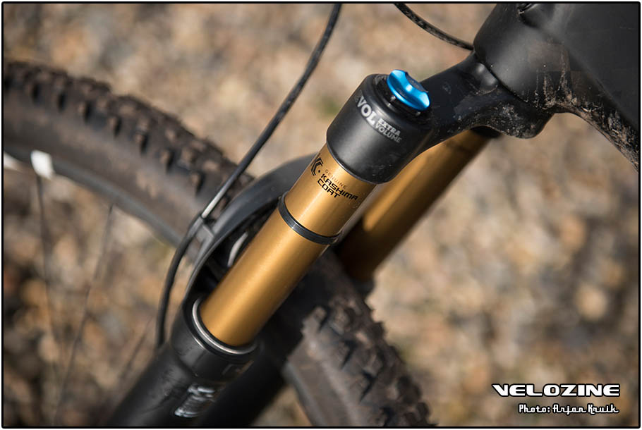 De vork en demper komen uit de Factory-serie van Fox en hebben dus de karakteristieke bronskleurige Kashima-coating. De demping van de uitgaande slag, de rebound, laat zich op allebei goed instellen. De demping van de ingaande slag is echter niet aan te passen. Of je hebt het hele systeem open staan, of je kiest ervoor – op asfalt bijvoorbeeld – om met de hendel op het stuur de boel op slot te zetten. Waarbij je ‘op slot’ niet letterlijk moet nemen, want bij grote klappen geven de veerelementen nog wel mee.