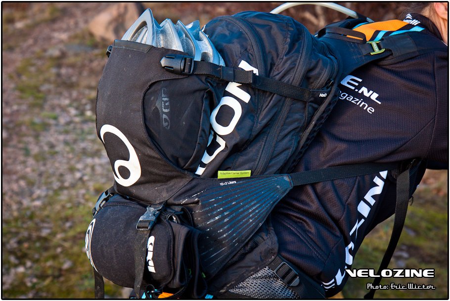 Als de heupband eenmaal goed zit dan rest alleen nog het afstellen van de schouderbanden. Aan de bovenzijde van de schouderband zit een soort scharnier. Dat is echt een vinding, want hierdoor loopt de schouderband automatisch via de weg van de minste weerstand en voel je nauwelijks dat je een rugzak draagt. Door het scharnier beweegt de rugzak mee met je (arm-)bewegingen. De borstband zorgt ervoor dat de boel stevig op zijn plek blijft. Bij mijn eerste testritje trok de rugzak ondanks al dit vernuft steeds naar één kant toe. Wat bleek? Eigen schuld! Ik had namelijk het compartiment aan de voorzijde, bedoeld voor je helm of natte kleding, maar aan één kant vastgemaakt. Dit compartiment vormt één geheel met de schouderbanden en moet je dus altijd vastmaken. Het lijkt onhandig, maar er is wel over nagedacht. Dit zorgt er namelijk voor dat de rugzak als het ware tegen je (onder)rug aan wordt getrokken en daardoor erg stabiel wordt.