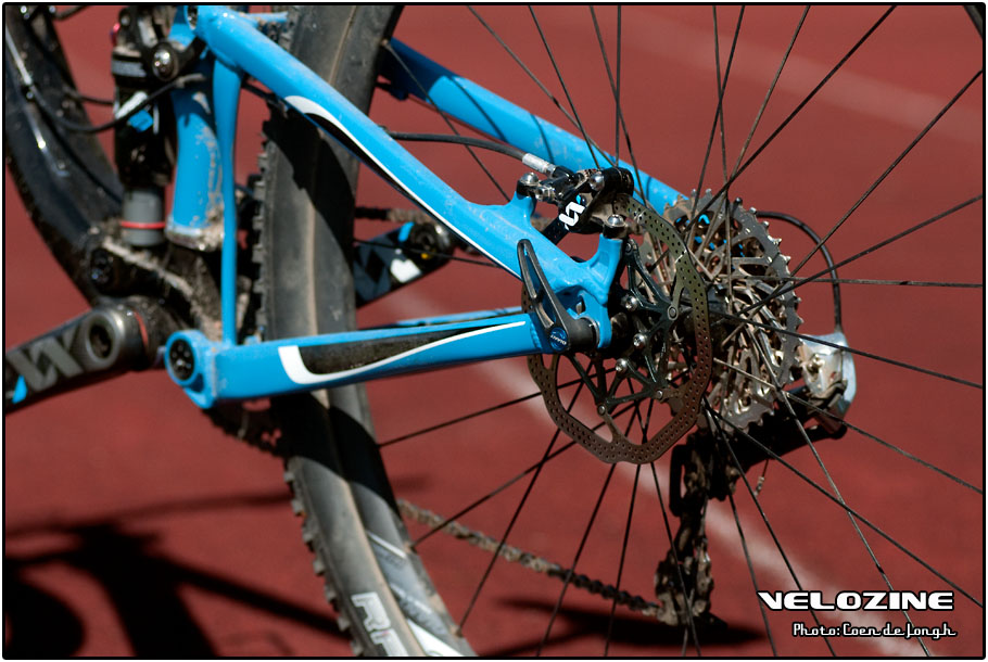 Maar… waarom zit er dan ‘maar’ een aluminium achterbrug in dit frame hoor ik je denken. Simpel, omdat ze bij Giant in het voorstadium ook met carbonnen achterbruggen getest hebben, maar deze erg complex zijn om te maken (en dus de prijs opdrijven), niet bepaald tegen impact van bijvoorbeeld de ketting kunnen en bovenal niet of nauwelijks stijver bleken te zijn. Geen enkele reden dus om dit ’the hard way’ te doen. Een ander opvallend iets in die achterbrug is het ontbreken van een steekas achter. Door het compacte ontwerp van de achterbrug echter is deze al zo stijf, dat een steekas hier eveneens niets toe zou voegen. Gewoon een 135 mm quickrelease naaf erin dus! De Rock Shox SID is echter wel voorzien van een QR15 as.