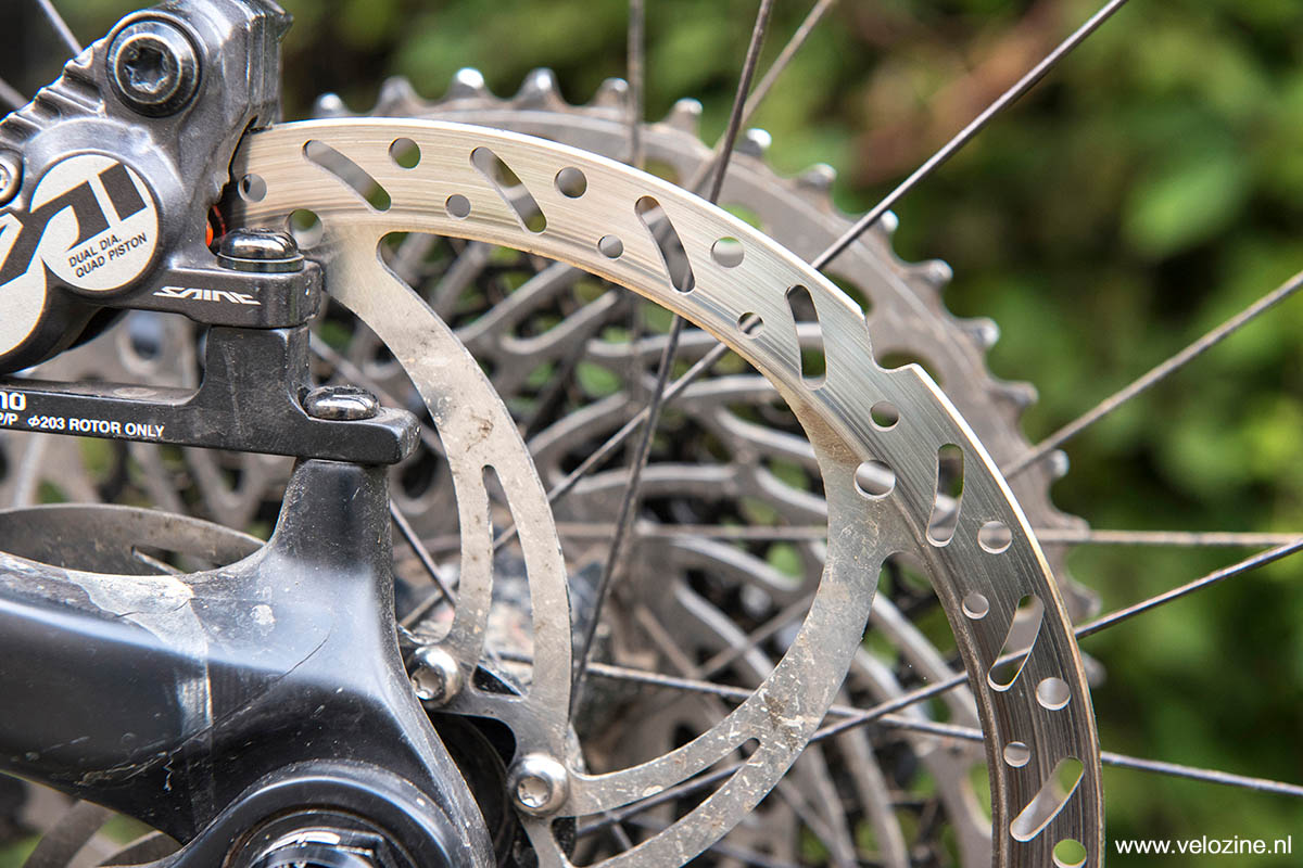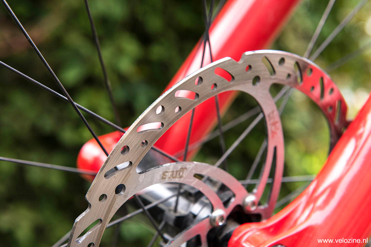 Nadelen zijn er natuurlijk ook. Een dikke remschijf weegt meer dan een dunne. Bovendien laten veel schijfremmen zich minder makkelijk sleepvrij afstellen met een dikke schijf á la Trickstuff. En ook al raadt menig schijfremfabrikant het af om een ander merk schijven en/of blokken in hun remklauwen te monteren; in veel gevallen kan dat zonder enig noemenswaardig praktisch bezwaar. Zo is dat bij mijn trouwe Saints óók geen enkel probleem. Wiel inhangen, rem inknijpen, remklauw aandraaien, klaar. Dat inhangen van het wiel op zich is trouwens ook appeltje-eitje, met dank aan de afgeschuinde buitenzijde (“Dächle”) waardoor de schijf makkelijker tussen de remblokken doorschuift.