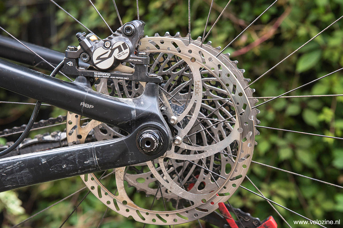 Eerst maar even over die Dächle Heavy Duty-remschijven. Trickstuff claimt dat ze van een buitengewoon hoogwaardig staal gemaakt zijn, dat over een 25% hogere trekkracht beschikt. Leuk om te weten, maar helaas niet verifieerbaar. Wat wél meetbaar is, is de grotere dikte die de Dächle HD-remschijven kenmerkt. 2,05 mm. Ter vergelijking: de originele Shimano-remschijven zijn nieuw maar 1,80 mm dik. Als het om remschijven gaat, is dikker beter. Méér metaal voert namelijk niet alleen warmte beter af, maar levert ook een remschijf op die onder invloed van hitte en ongewenst contact met rotsen minder snel verbuigt én langer meegaat.