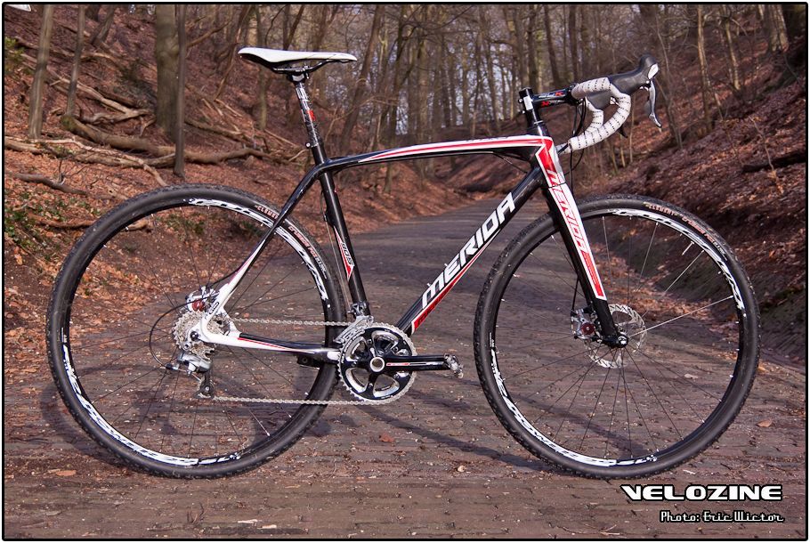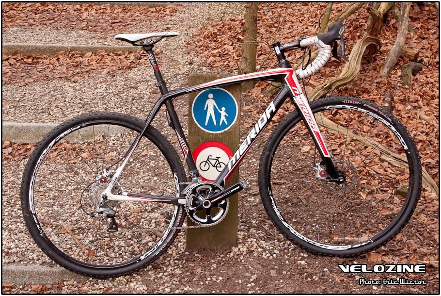Yep, schijfremmen. Goed gespot, heren. De drager van die remmen is de Merida Cyclo Cross Carbon 5-D. Ondanks de schijfremmen weegt hij, mede dankzij carbon frame en vork, nog geen 9 kilo. Dit model heeft een adviesprijs van €2999,- en zit net onder het topmodel van Merida, de Cyclo Cross Carbon Team. De ‘Team’ is eveneens van schijven voorzien en daarmee zet Merida vol in op de laatste trend. Dat wordt ongetwijfeld geholpen door het feit dat ze geen cyclocross team met aan cantilevers verknochte profs sponsoren.