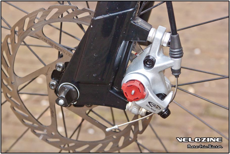De Cyclo Cross Carbon 5-D is voorzien van uitstekend werkende én smoelende onderdelen. Shimano Ultegra behoeft geen toelichting. De BB7-road remmen zijn voorlopig nog de referentie op schrijfrem gebied voor de weg/veldrijfiets. De schijfdiameters zijn 160 millimeter voor en 140 millimeter achter, wat voor het doel goed werkt. De draaiknoppen voor de afstand van de blokken tot de schijf zijn zeer eenvoudig te bedienen, maar afstellen vraagt wel wat aandacht. Blokken te ver van de schijf af betekent dat je je remhendels tot het stuurlint trekt en een vaag remgevoel. Te dichtbij en er is meer geluid en slijtage dan nodig is. Van de online handleidingen voor het afstellen is dit mijn favoriet. Volg nauwgezet en succes is gegarandeerd.