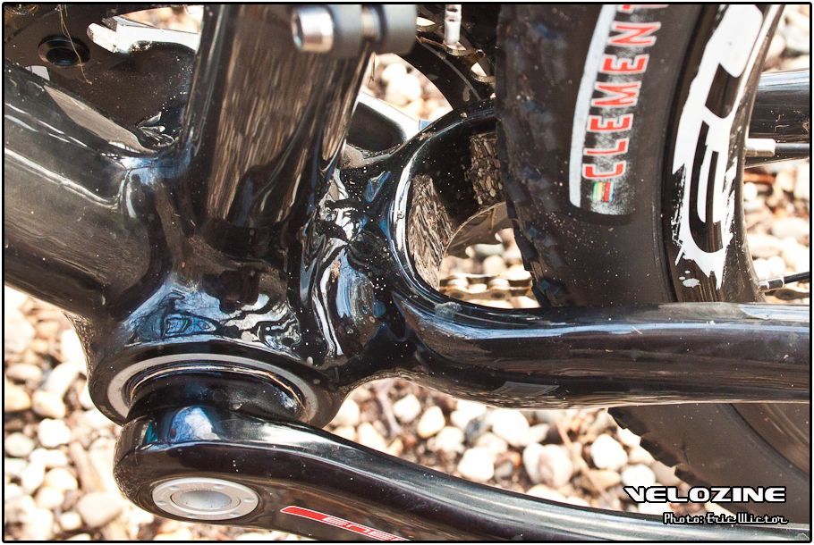 Zo krap je er mee kan sturen, zo ruim baan hebben de banden in het frame en de vork. Je kan erg lang in plakkerige modder blijven rijden zonder dat alles vol gaat zitten en de fiets niet meer vooruit te branden is. Je mag best weten: ik heb op hetzelfde parcours in dezelfde omstandigheden met mijn eigen veldrijfiets 3x in 1u stil gestaan om gras/klei mix handmatig te verwijderen. De modder-vrijheid is gedeeltelijk een verdienste van de schijfremmen, immers, cantilever remmen zijn notoire moddervangers. Toch mooi hoe remmen er voor kunnen zorgen dat je minder afgeremd wordt. Hiernaast is er met name bij het trapas goed nagedacht over zoveel mogelijk vrije ruimte rondom de band en dat betaalt zich uit. Daar maakt de Merida het verschil met mijn eigen, ook van schijfremmen voorziene fiets. Bij andere carbon frames is de uitstulping tussen bottom bracket en liggende achtervork vaak groot, vierkant en dus een mooi opvangdakje voor modder. Niets van dat bij de Merida, met een groot gat achter de band, afgeronde vormen. Dat is bij deze genoteerd als eis voor mijn volgende cyclocrossframe.