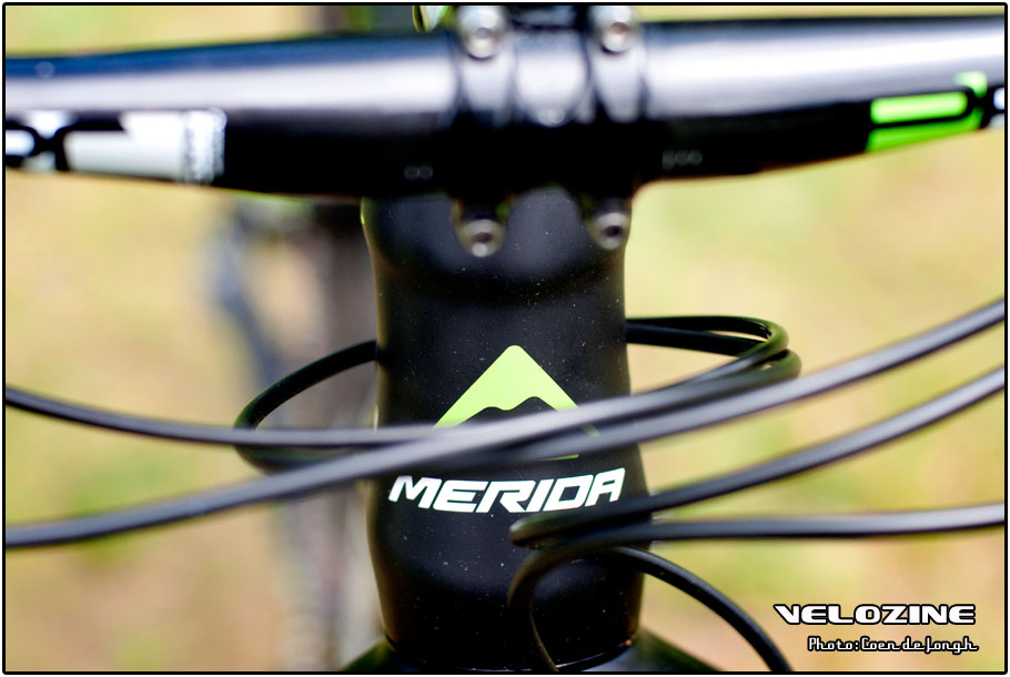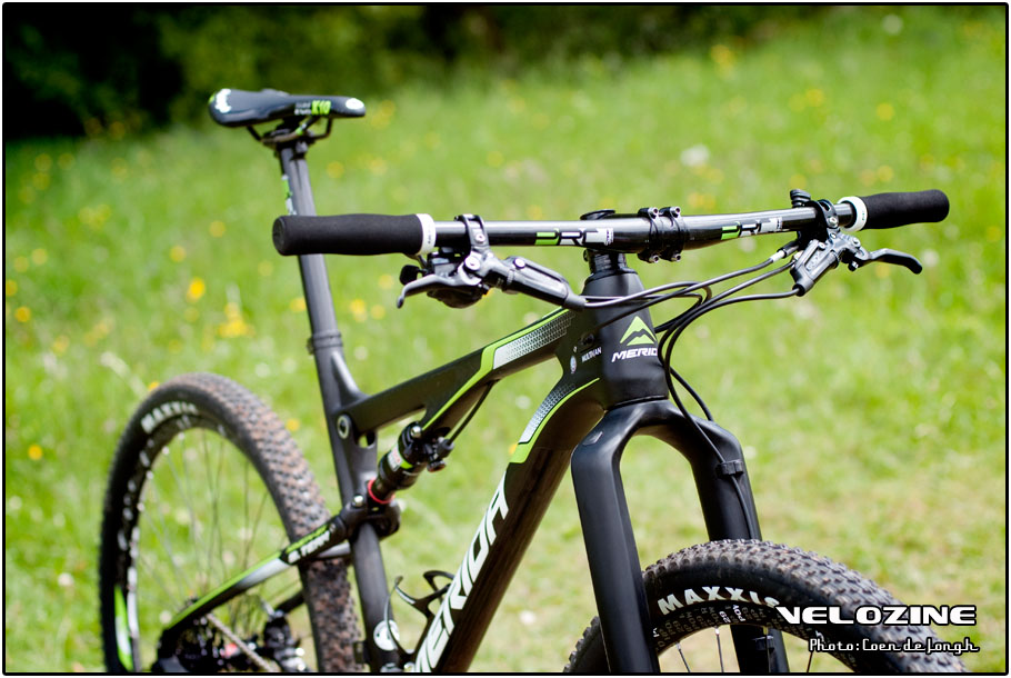 Terug naar die ‘lekkere onderdelen cocktail’, de testfiets zoals wij em afgelopen weekend reden is voorzien van een mix SRAM XX1 (met 32t voorblad), Rockshox RS-1 vork en Monarch achterdemper, Fulcrum wielen met daaromheen Maxxis Aspen banden en verder Merida’s eigen PRC onderdelen (zadelpen, stuurpen, stuur) en een Prologo zadel. Dat is in ieder geval geen afmontage waar je je bij je vrienden voor hoeft te schamen!
