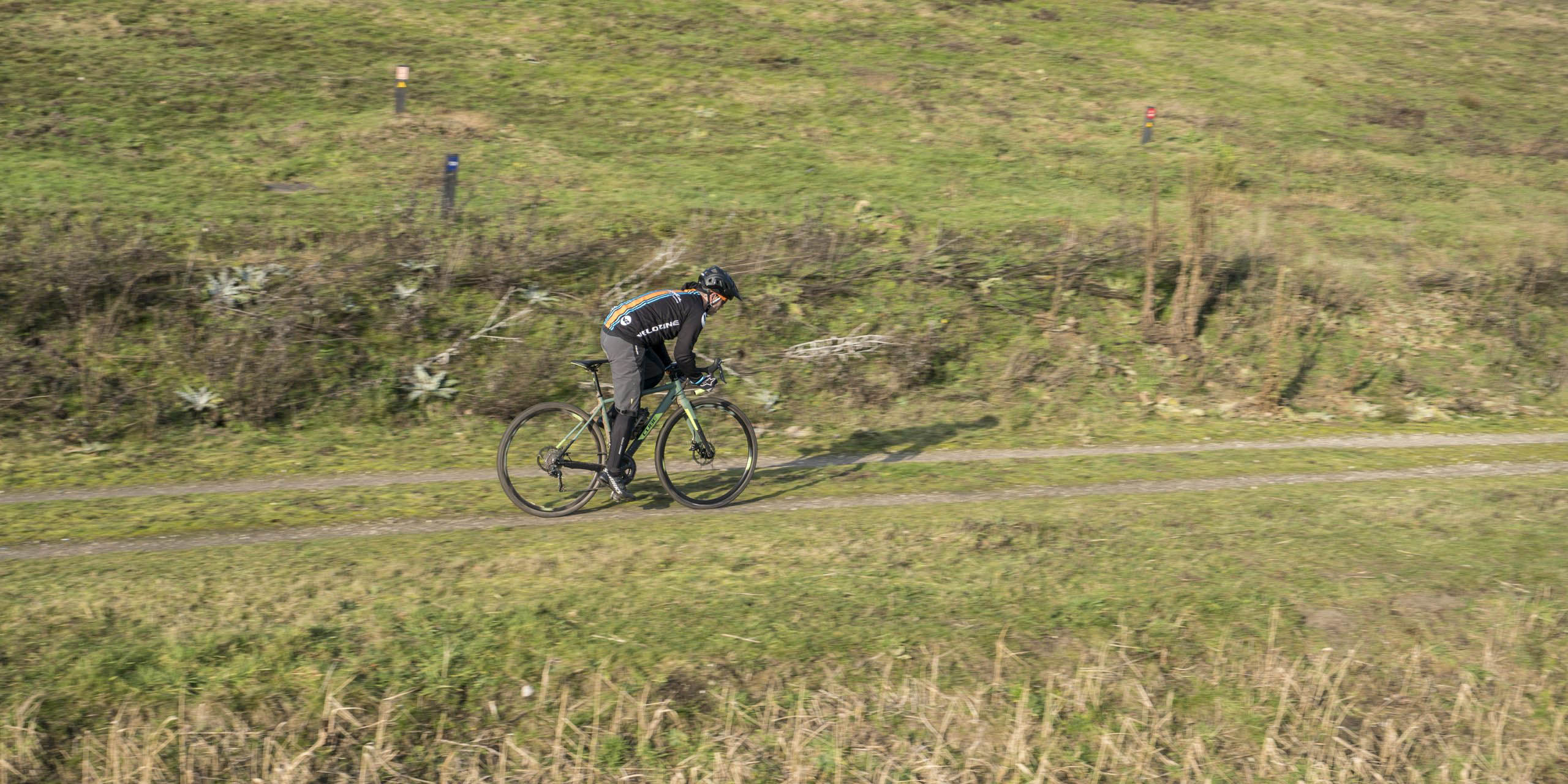 Al jaren haspel ik ook rondjes af op een cyclocrosser die het merendeel van zijn tijd gladde banden heeft. Ik zie het als training voor basisconditie, maar ook als een welkome afwisseling voor wanneer ik geen zin heb in de fysieke belasting van het stuiteren op de mountainbikerondjes. Maar de rondjes rond de kerk over écht verhard spul was ik al zó snel beu dat ik het nooit heb kunnen laten om ook met de smalle-banden-fiets het onverharde weer op te zoeken. En daar kwam ik met 28 tot 32 mm bandjes – die niet op de racer maar wel op een crosser passen – een stuk beter uit de voeten. Het gemak waarmee je met zo’n fiets snelheid maakt op het asfalt, zeker wind mee (…), geeft óók een head rush, zeker als je gewoon door kunt denderen wanneer het asfalt ophoudt.