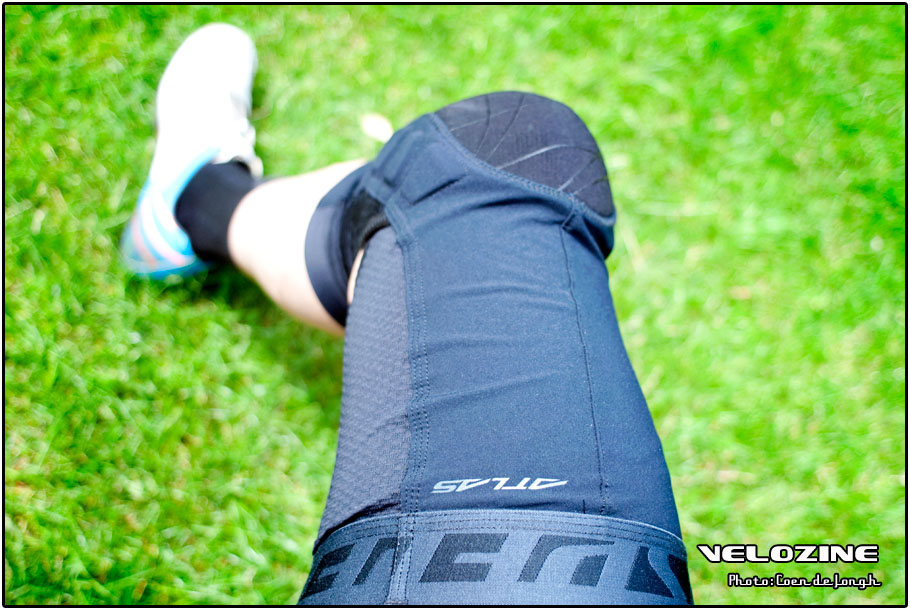 De Atlas kniebeschermers zijn eigenlijk niet meer dan hierboven staat: Lycra kniestukken, waar een slim stuk materiaal in verwerkt is wat voor de bescherming zorgt. Ik noemde het gekscherend BRAIN naar Specialized’s ‘slimme technologie’, maar het is natuurlijk gewoon een onder impact verhardend materiaal zoals het al genoemde D3O en bijvoorbeeld Armourgel. De kracht van deze kniebeschermers vind ik persoonlijk dat ze uit zijn gegaan van Lycra kniestukken. Die zitten per definitie fijn, zonder te warm of restrictief te zijn. Aan de bovenkant zijn de beschermers voorzien van een brede elastische band, waarop ook silicone anti-slip stippen zijn aangebracht. Net als die Lycra kniestukken, kun je deze Atlas beschermers ook onder de pijpen van je bibshort stoppen, waardoor ze nog beter blijven zitten. De onderkant van de beschermers is gewoon Lycra, geen anti-slip, geen band. Daardoor hebben ze wel enigszins de neiging om op te kruipen (naar het smalle deel van je knieholte toe) als je net op de fiets zit. Met name als je flink warm begint te worden en gaat zweten, gaan de beschermers aanzienlijk fijner zitten. De warmte zorgt ervoor dat de beschermlaag zacht wordt en zich aanpast aan aan de vorm van je knieën, terwijl het zweet ervoor zorgt dat het Lycra tegen je huid aan plakt.