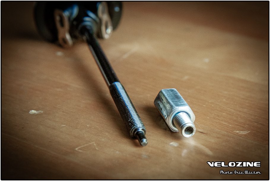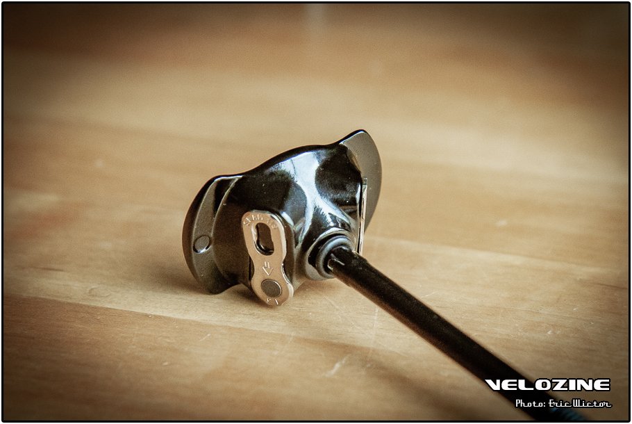 Eigenlijk bestaat de CC tool uit drie delen: een klein inbusset, een houder die van boven in de stuurbuis schuift, en een lange bout met kapje die je van onderaf door de stuurbuis in de houder schroeft. Het geheel weegt in de langste configuratie 132 g. De houder en bout doen samen dienst als kettingpons én als headlock voor je balhoofd. Het is een doodsimpele oplossing natuurlijk, die ervoor zorgt dat het geheel erg simpel te (de)monteren is. Bovendien houdt het de tool strak in je stuurbuis en is er nul kans op gerammel.