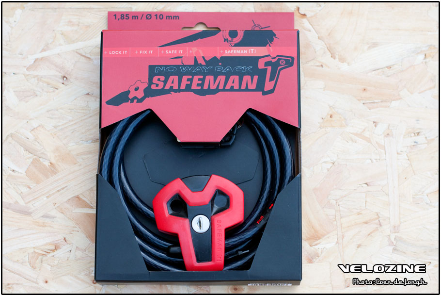 De Safeman-T is beslist geen opvolger of vervanger van de originele Safeman. Met 550 gram schoon aan de haak en een diameter van 17 cm in opgerolde toestand, kunnen we bij het nieuwe model ook niet echt over een klein slotje spreken. Hij wordt door de producent aangeprezen als ‘een steviger multifunctioneel slot met een langere kabel’ voor ‘als je kostbare materiaal langere tijd uit het zicht staat’. De Safeman-T heeft wel hetzelfde werkingsprincipe als het origineel, waarbij de kabel simpelweg door het slot gelust wordt. Met dit slot kun je daarmee makkelijk fiets en accessoires (helm, tas, extra paar wielen) op slot zetten. Het slot is ook lang genoeg om je voorwiel niet uit je vork te hoeven halen om ook deze op door het slot te rijgen.