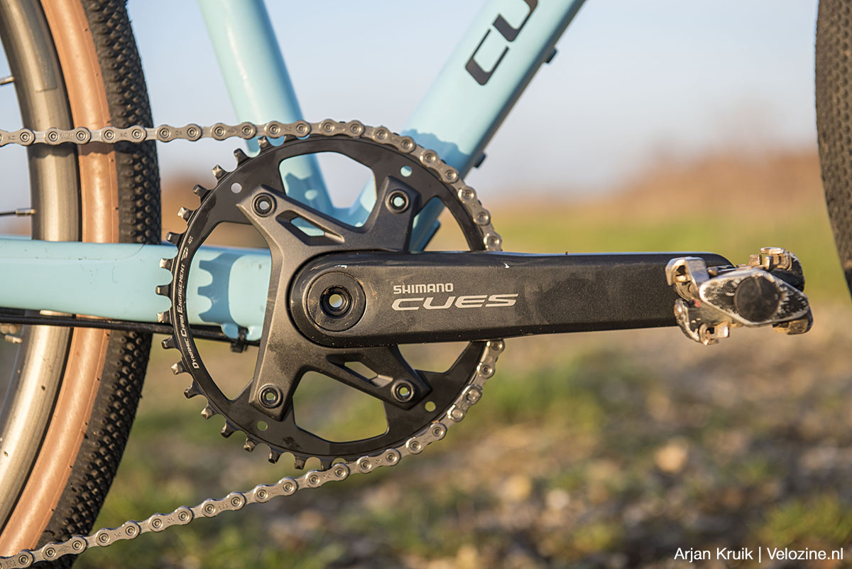 En juist op dát punt laat 1×11 Cues steken vallen. Alhoewel een lichtste verzet van 50/40 voor wielrenners haast lachwekkend licht is, blijkt tijdens het maken van buitenlandse gravelbiketochten het tegendeel waar: het komt regelmatig voor dat het lichtste verzet te zwaar is. En het stomme is: je kunt géén kleiner voorblad monteren. Shimano biedt de keuze uit 40- of 42-tands. Onbegrijpelijk, want zoals ik al schetste zijn kopers van gravelbikes met Cues eerder relaxte toerders dan afgetrainde atleten. En ook die toerders willen graag boven komen zonder te hoeven afstappen. En de kans dat dat lukt is groter met een 38er of zelfs een 36er als voorblad. Waarmee je, zoals iedere mountainbiker kan beamen, óók nog makkelijk snelheden boven de dertig kilometer per uur kan bereiken.