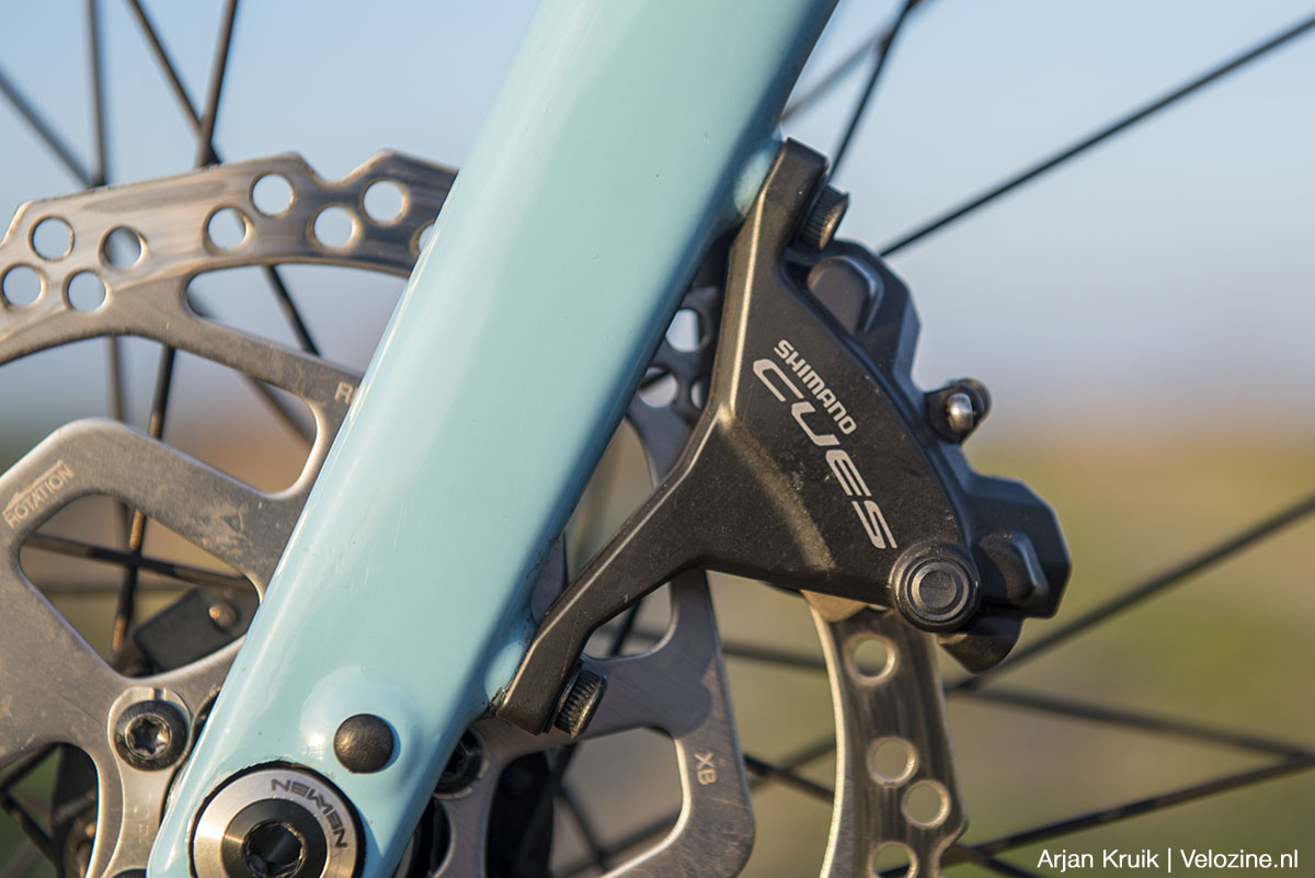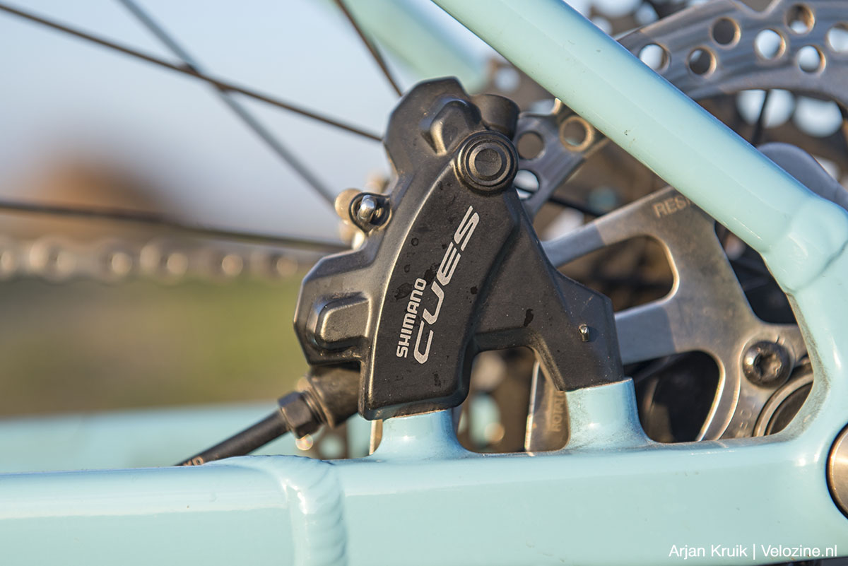 De remkracht en doseerbaarheid zijn ronduit goed – niet meer of minder dan bij de op die punten eveneens fijne Shimano 105- en GRX-remmen. Puntje van aandacht zijn de remschijven met de fraaie naam SM-RT54. Het staal van deze gestanste budgetrotors is niet echt hard en bovendien blijft er door de wat onregelmatige stansstructuur modder en vuil op het oppervlak de schijf achter, wat bij nat weer de remkracht reduceert en op de langere termijn voor versnelde slijtage zorgt. Hier loont een upgrade naar betere remschijven.