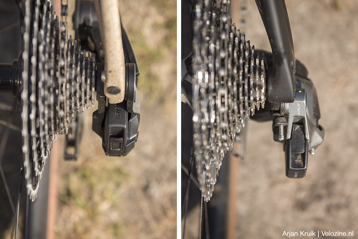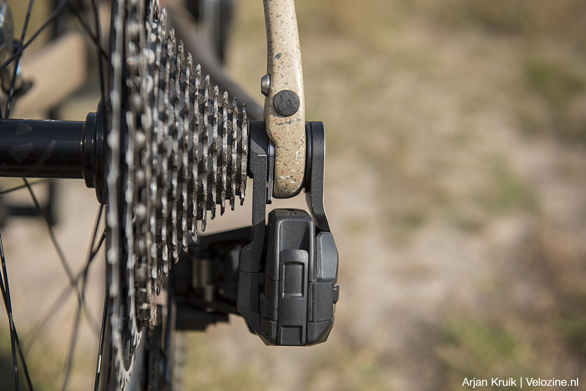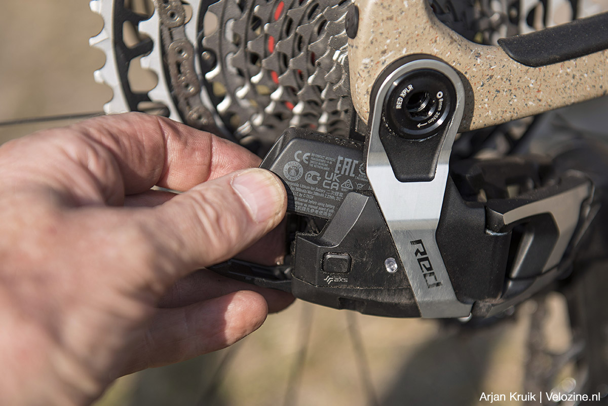 Nu ik toch de vergelijking maak tussen 12-speed XPLR AXS met gewone derailleur en de 13-speed Red XPLR AXS met full-mount-derailleur: los van de directe montage op de achteras heeft deze nieuwe derailleur tevens een veel straffere frictiekoppeling. De ketting gaat daardoor op stuiterpaden dus niet meer als een malle tekeer. Dat komt niet alleen de schakelkwaliteit ten goede, maar scheelt tevens een hoop geklapper. Een fiets met 13-speed Red XPLR AXS is dus een stillere fiets.
