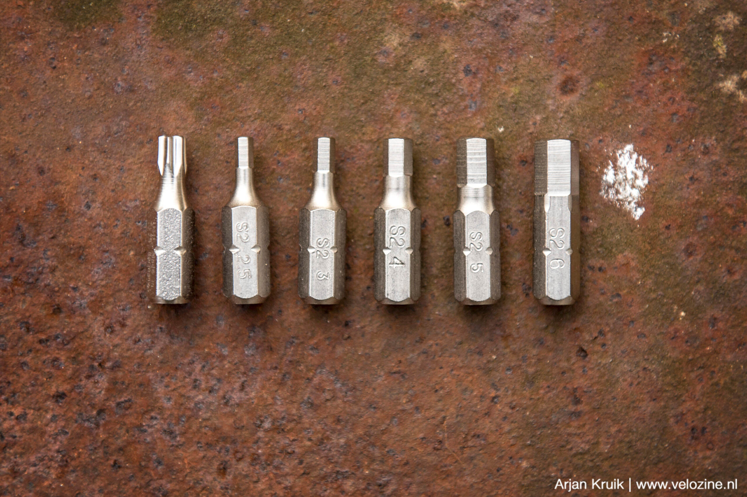 Een T25 torx-bitje en 5 inbusbitjes, van 2,5 tot 6 mm.