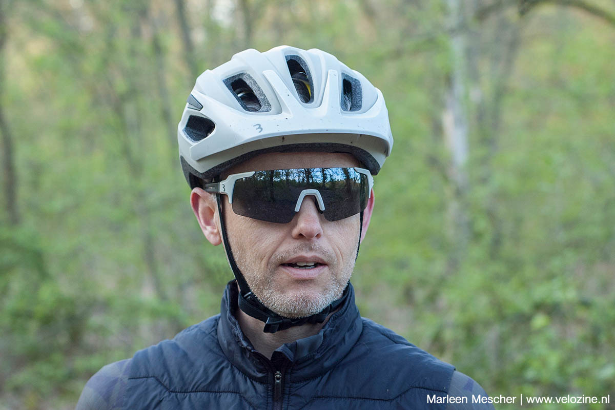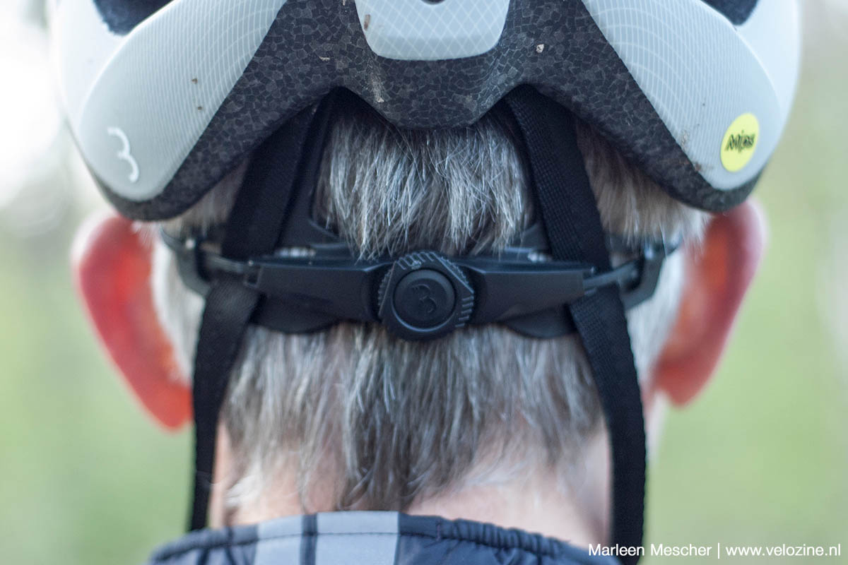 Het spansysteem is goed verstelbaar. En het draaiwieltje en de klikjes bij het verdraaien voelen degelijk aan. Qua hoogte kun je het spansysteem in drie posities zetten, waarbij de afstand tussen de standen wel vrij groot is; een paar tussenstapjes had niet misstaan. De kinband zit bij mij op een logische plek. De gespen aan beide zijden van de riempjes zitten vrij los; ze zijn daardoor goed te verstellen. Ik merk alleen dat zodra ik de gespen dicht naar mijn oren beweeg, het voorste bandje snel tegen mijn oren komt. Ik heb de gespen dan ook, zoals je op de foto’s ziet, zowat maximaal naar beneden zitten. Zodoende bleven riempjes mooi vrij liggen van oren, nek en de poten van de fietsbril.