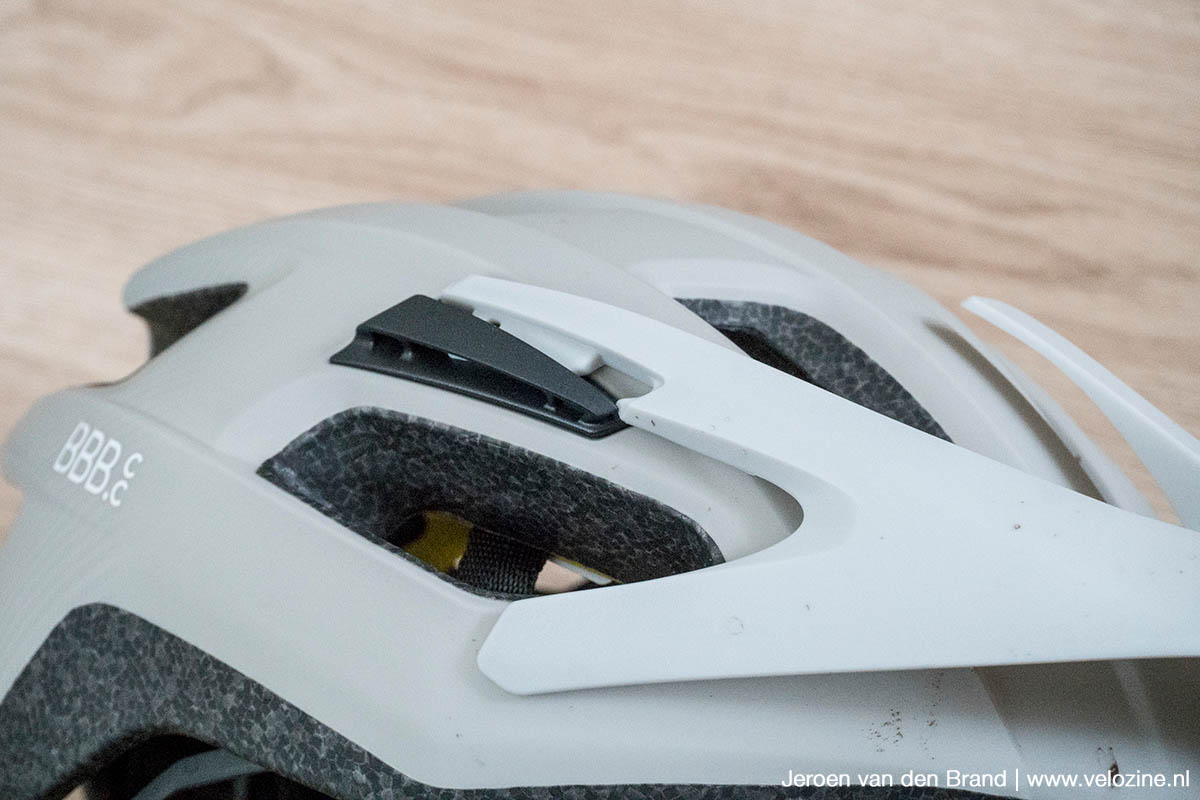 De helmklep – of ‘visor’ – is niet verstelbaar, wél afneembaar. De verbinding is robuust; kop een tak uit de weg en je hoeft niet bang te zijn dat je de helmklep verliest. Qua formaat is-ie voldoende compact om niet het zichtveld teveel te limiteren, groot genoeg om zon uit je ogen te houden. Zit je dieper voorover op je bike; klik ’m los en laat ’m lekker thuis.