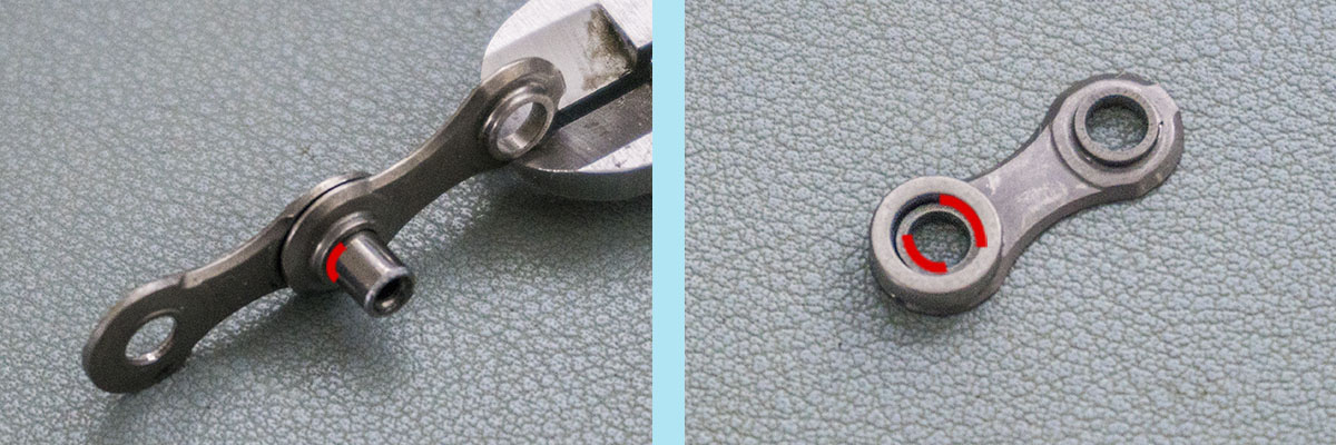 Tijdens het in- en uitlopen van de ketting bewegen de delen ter hoogte van de pin ten opzichte van elkaar. En dat gebeurt dus onder hoge kracht. Die kracht én beweging zorgen voor slijtage in al deze onderdelen van de ketting. Voeg nog wat water en fijn grut van Moeder Natuur toe en de slijtage gaat nog sneller. Smeren met olie of en wax helpt die slijtage af te remmen, maar uiteindelijk komt er onvermijdelijk speling tussen de pinnen, de binnenschalmen en de rolletjes. En wanneer de ketting op spanning staat, trek je de boel door die speling uit elkaar, waardoor de exacte locatie van de pinnen in de ketting niet meer nauwkeurig overeenkomt met de spatie van de tanden op je kettingbladen. En zie hier de reden waarom die tanden dus óók slijten als de ketting slijt.