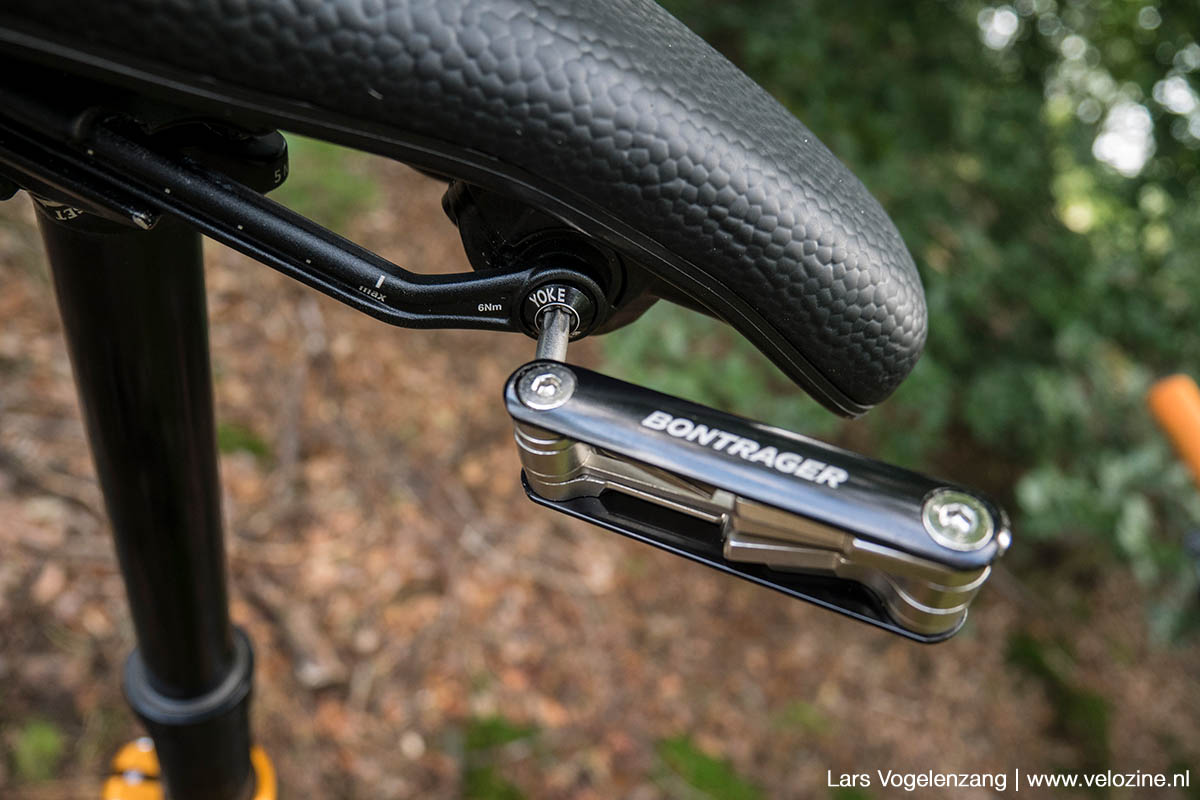 De montage van houder van de Bontrager Bits multitool is easy peasy… tot de laatste stap. Je hoeft géén schroefdraad in je vorkbuis te snijden, zoals bij de “oervader-van-de-in-de-balhoofdbuis-tool” OneUp. Nee, tik simpelweg de starnut uit je vork, kijk op de tabel in de verpakking welke bout en spacers je nodig hebt en draai het geheel vanaf boven in elkaar met een lange inbussleutel. Stel dan met diezelfde bout vanaf boven of onder de lagerspanning van je balhoofdstel in.