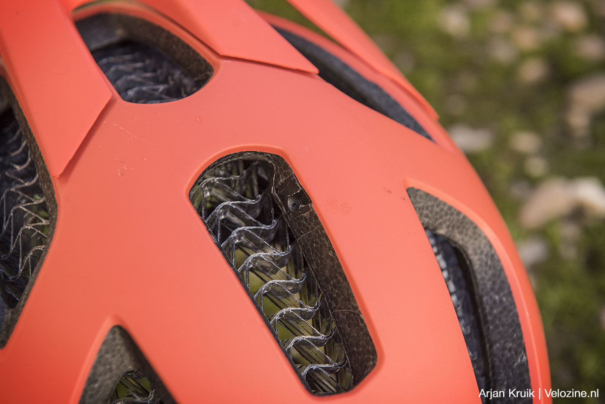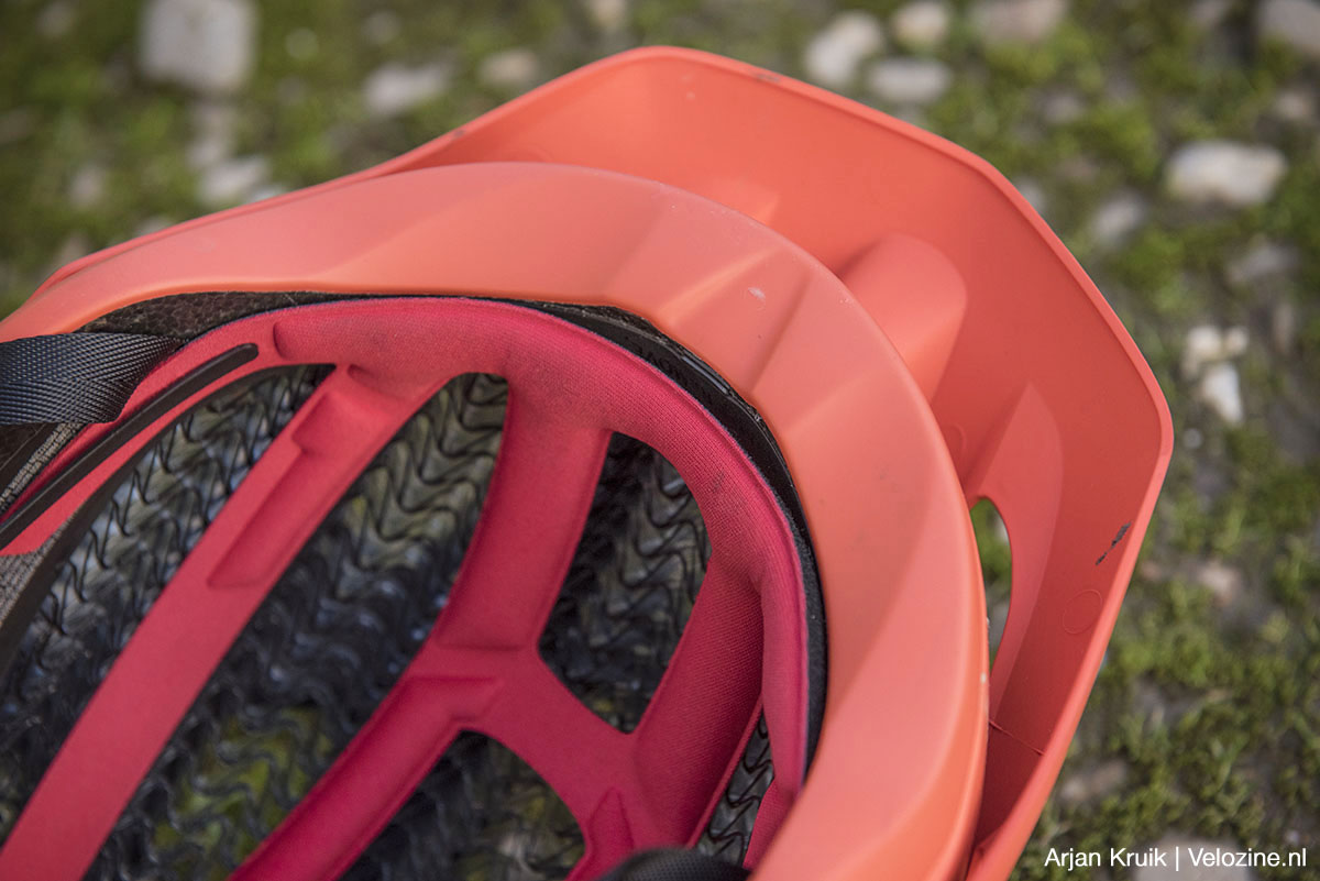 Waar ik natuurlijk wél wat over kan zeggen is alle andere zaken die bij een mountainbikehelm van belang zijn. Pasvorm, ventilatie, gebruiksgemak, degelijkheid, gewicht. Om maar even met dat laatste te beginnen: de maat M testhelm weegt 418 gram. Dat is best fors. De ‘binnenhelm’ van Wavecel-materiaal is daar ongetwijfeld debet aan. Maar ook de constructie op zich is degelijker dan gemiddeld. Zo loopt de ABS-buitenschaal helemaal door tot over de randen, zodat de relatief kwetsbare binnenschaal van polystyreen-schuim (EPS) nergens onbedekt is. Dat komt de levensduur ten goede, maar voegt ook gewicht toe.