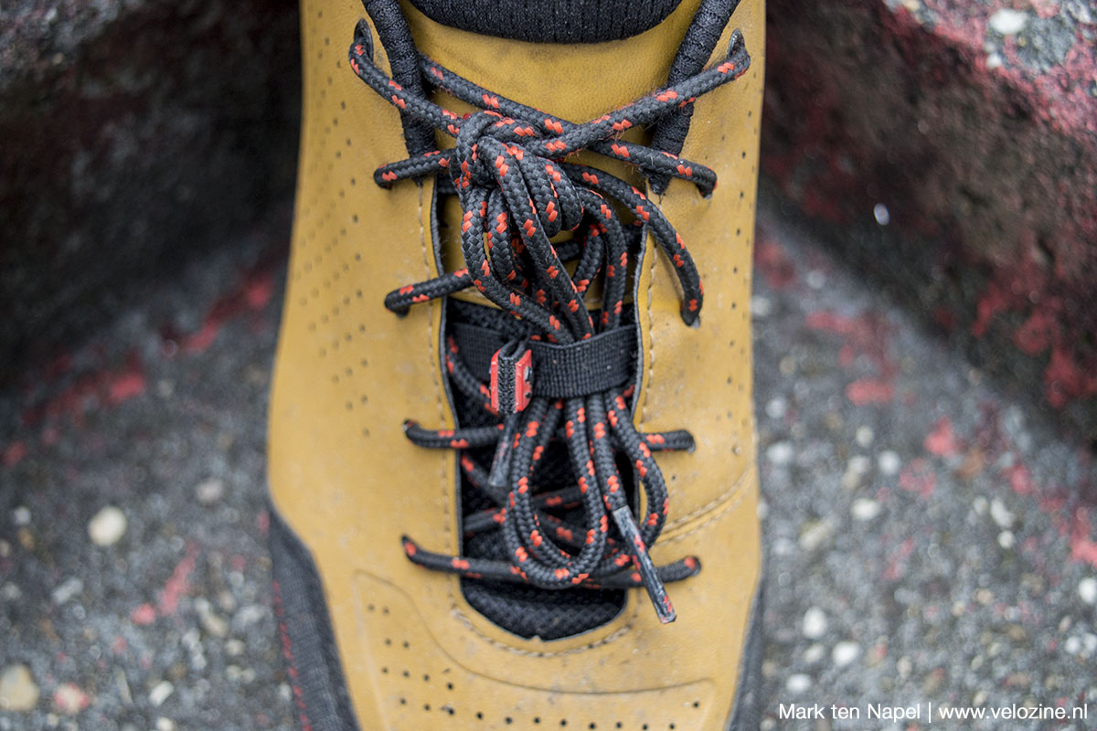 Niet alleen de latte macchiato-kleur geven bij deze Bontrager GR2’s een retro-look; ook de vetersluitingen. En aan veters ook geen gebrek, want ze zijn erg lang. Om te voorkomen dat ze rond je pedalen draaien is een elastieken lus halfweg de tong voorzien, waaronder je de uiteinden kunt wegstoppen. Het kunstlederen bovenwerk is op de gevoelige schuur- en schaafplaatsen rondom ingepakt met ‘GnarGuard’-rubber. De aansluitingen zijn overal strak en netjes. En die indruk wekken de schoenen eigenlijk op elk detail.