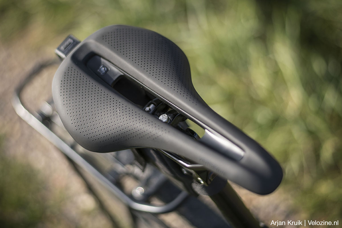 Het materiaal van het zadeldek heeft de juiste stroefheid. De vorm en breedte van het zadel en de hardheid van de schuimvulling passen goed bij mijn fysiek, zithouding en rijstijl, met afwisselend m’n handen bovenop het stuur en onderin de beugels. Vanwege het vlakke langsprofiel kun je makkelijk je gewicht verplaatsen, een kleine kick aan de achterkant biedt steun als het pad steil omhoog gaat.