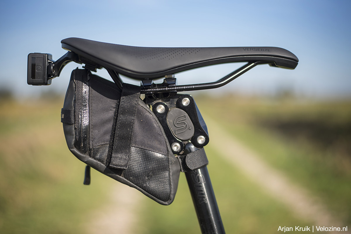 Als je een Bontrager Verse koopt krijg je er een Blendr-accessoirehouder. Blendr is de naam van een reeks zadelaccessoires van Bontrager en Trek die je snel en makkelijk op- en aan elkaar vast kan klikken. Verschillende houders, een lampje, een spatbord en een zadeltasje. Om deze test compleet te maken ben ik ook daarmee op pad geweest. Het monteren is kinderspel. De houder zit je met twee boutjes vast aan de onderkant van zadel in de twee daartoe bestemde tapgaten. En vervolgens klik je er naar wens één of meer Blendr-accessoires aan.