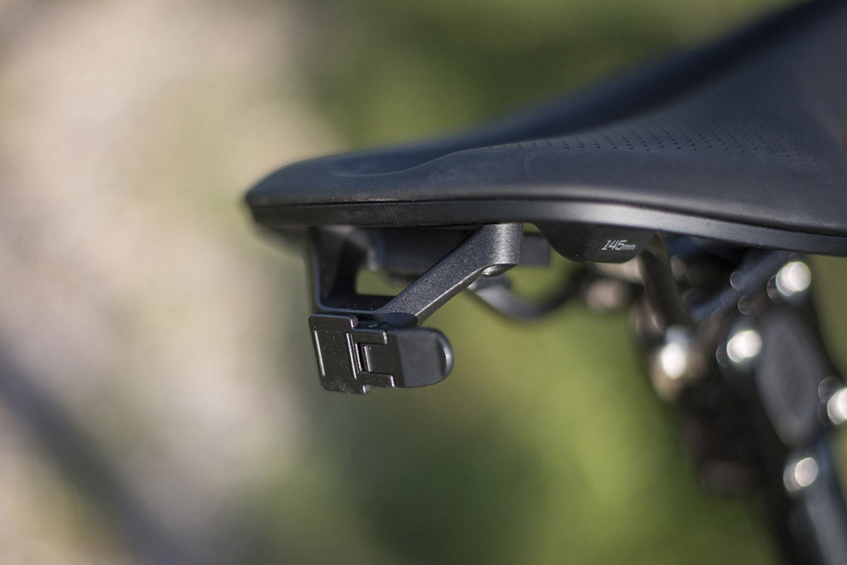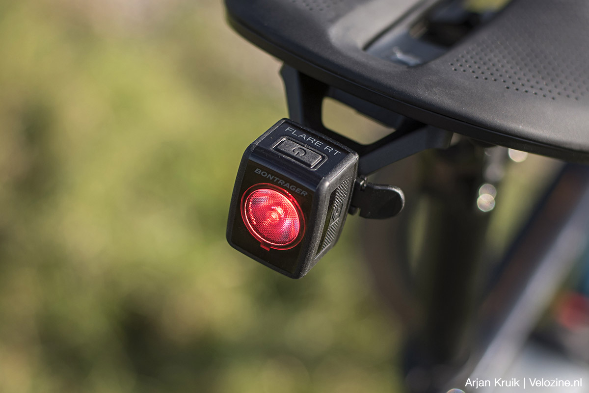 In mijn geval zijn dat een Bontrager Flare RT-achterlicht (59,99 euro) en een Trek Blendr Fendr (14,99 euro). Dankzij een praktisch kliksysteem kun je deze producten los van elkaar gebruiken of juist gecombineerd. Met dat laatste als doel is de Blendr Fender uitgerust met hetzelfde kliksysteem als de Blendr-accessoirehouder onder het zadel. Het lampje past derhalve zowel op het zadel als op de het spatbordje. Ik vind dat Blendr-spul best wel praktisch. Natuurlijk, je kunt een lampje bijna net zo snel met een rubberbandje aan de zadelpen klemmen. Maar los van het gebruiksgemak ziet het Blendr-systeem er ook strak uit.