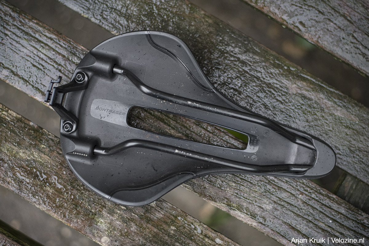 Nog even wat specs: de rails zijn van hol roestvast staal, de schaal van kunststof. Het zadeldek is van kunstleer dat in het midden is uitgevoerd met een gaatjespatroon. Het materiaal is duidelijk gladder dan dat van de lange Bontrager Verse. Aan de randen is het zadeldek verstevigd ter bescherming tegen valpartijen.