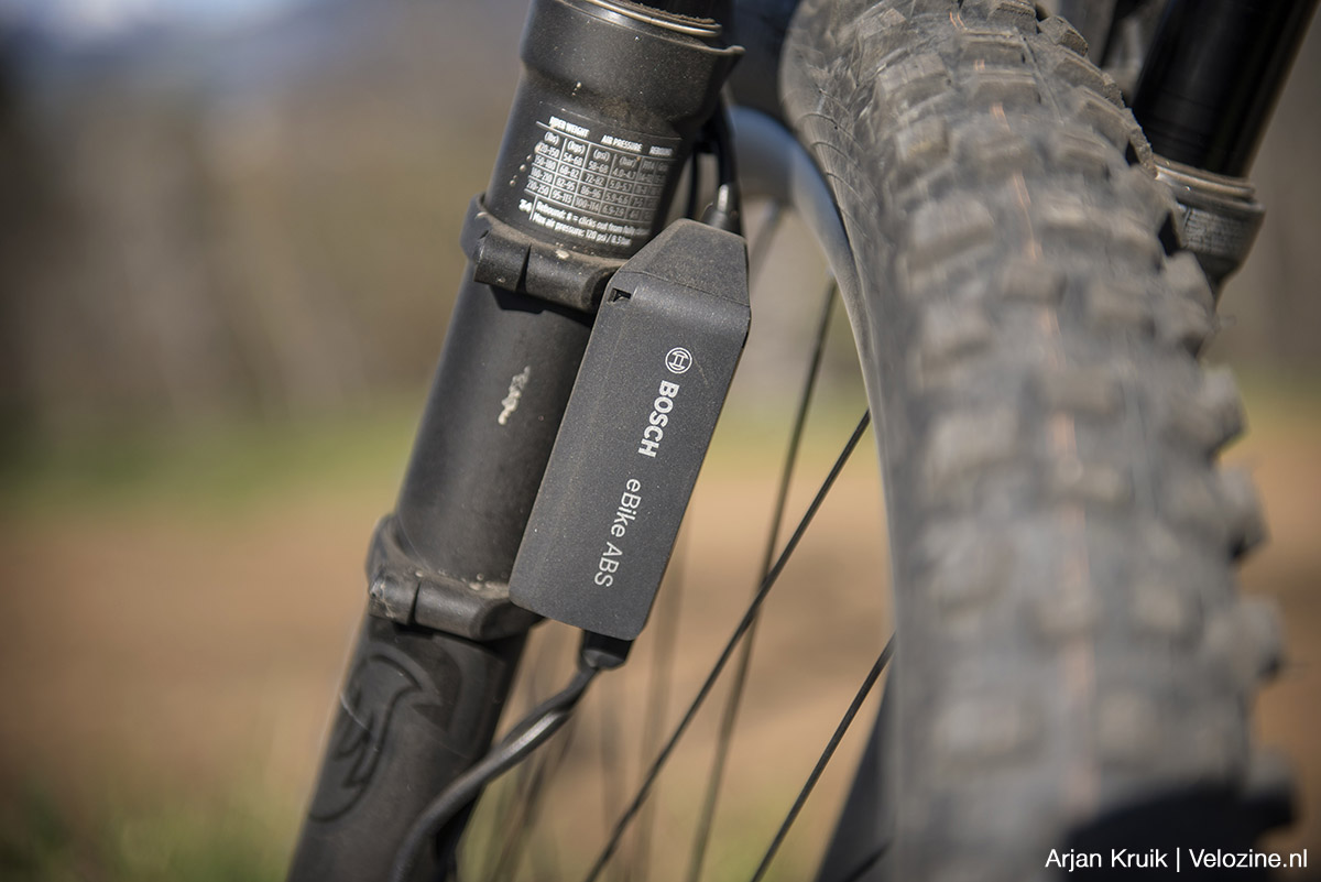 ABS dus. Of anti-blokkeersysteem. Op een e-mountainbike doet een anti-blokkeersysteem hetzelfde als in een auto: voorkomen dat wielen blokkeren bij te bruusk remmen. Want of je nu vier of twee wielen hebt, zodra er een wiel blokkeert en gaat glijden is gedaan met de controle. ABS zorgt er daarom voor, dat de wielen niet kunnen blokkeren, maar blijven rollen. Want wielen die rollen, die behouden grip en blijven bestuurbaar. Om dat voor elkaar te krijgen zijn basaal drie zaken nodig: sensoren op de wielen, een extra oliereservoir met kleppen en een elektronische regelunit.