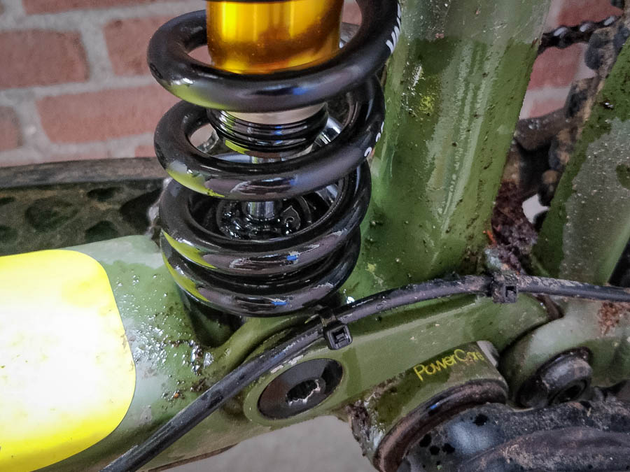 Met zo’n schroefveer in je fiets heb je al snel het gevoel dat hij onverwoestbaar is, het is immers geen bus samengeperste lucht die met vele centimeters rubberen afdichtingen in elkaar moet blijven zitten in ruwe vuile omstandigheden. Toch heb ik het voor elkaar gekregen om twee vervangende dempers te ontvangen van importeur Cosmic Sports. Het eerste defect trad op tijdens een bezoek aan Bikepark Winterberg. Na het experimenteren met de hoeveelheid voorspanning merkte ik dat de kop van de demper gedraaid was. Zelfs zo ver dat hij mijn frame raakte. Gelukkig was de schade aan mijn frame vooral cosmetisch. De kop wilde niet meer vastgedraaid blijven, en moest hij dus terug naar Cosmic Sports voor reparatie. De gerepareerde demper hield het alleen ook niet lang vol; na een testrit en een weekje in opslag deponeerde deze door een gescheurd binnenwerk zijn volledige inhoud aan olie op mijn garagevloer. Gelukkig heeft het vervangende exemplaar het daarna nooit meer laten afweten.
