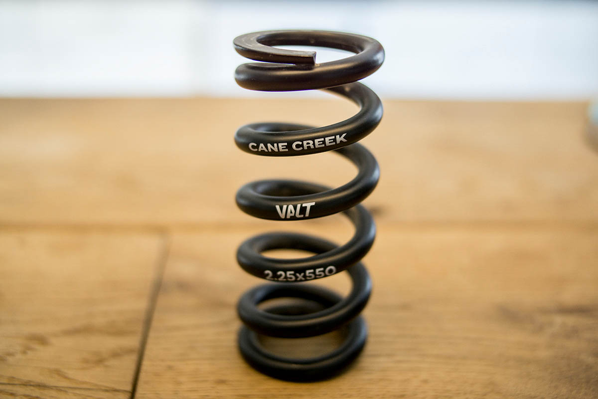 Bij Cane Creek heb je keuze uit drie verschillende soorten schroefveren: Standard, Valt en Progressive Valt. De standaard veren zijn niet zo interessant voor deze relatief lichte demper. De Valt veren wel. Die zijn zo’n 25% lichter zijn dan de standaard veren. De Progressive Valt is een recente innovatie, en laat je toe om een schroefveer te monteren op een fiets waarbij de veerkarakteristiek eigenlijk te lineair is.