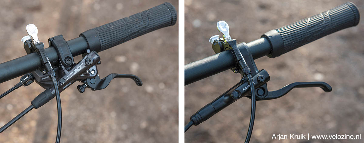 Maar goed, terug naar de vergelijking tussen de aluminium Big-Nine 700 en de carbon Big-Nine 3000: want als de strijd om het hoogste comfort en de meeste tractie niet beslecht kan worden, op basis van welk argument moet je dán kiezen? Je komt dan tóch terecht op het niveau van de afmontage. Eerst maar het makkelijke deel van dit verhaal: de remmen. De Shimano XT-remmen op de Big-Nine 700 zijn op alle fronten – remkracht, doseerbaarheid, gewicht en ergonomie – superieur aan de goedkope groeploze Shimano MT400-stoppers op de Big-Nine 3000. Rijd je alleen vlakke parkoersen, dan zal dat je waarschijnlijk een worst zijn. Maar wie z’n bike zo nu en dan uitlaat buiten de landsgrenzen is beter af met de XT-remmen dan met de MT400’s.