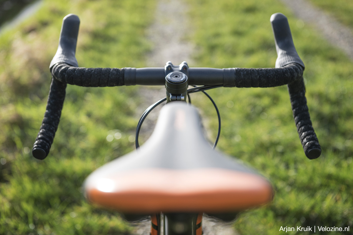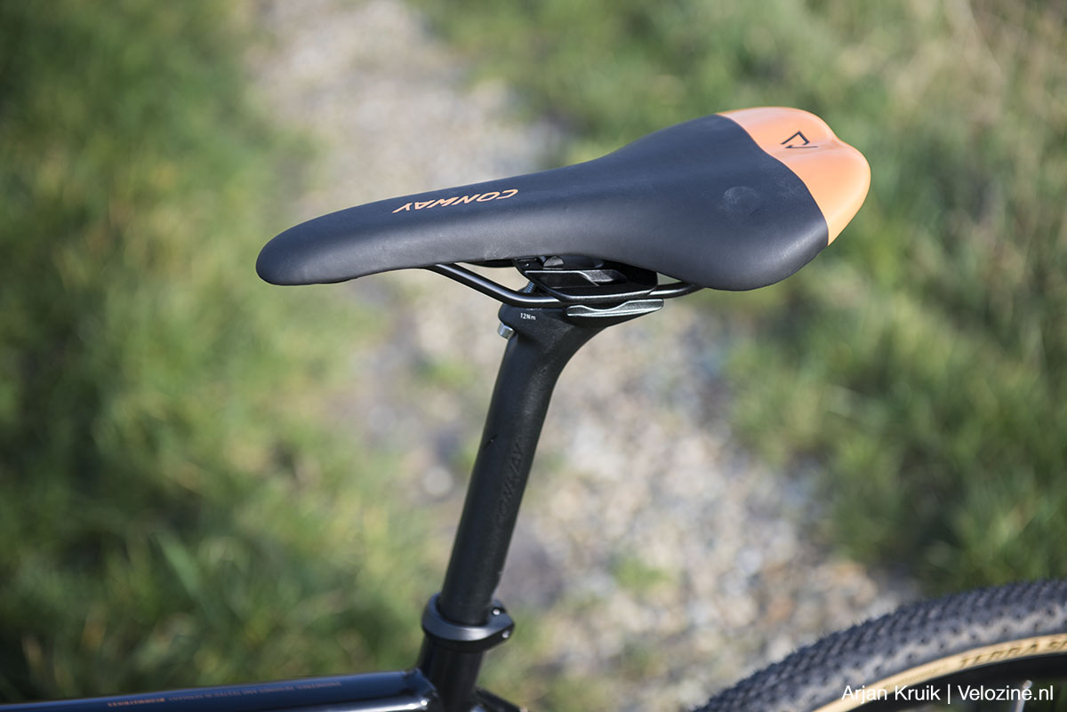 Desondanks zijn de wielen de achilleshiel van de Conway GRV 6.0. Dat is met name te wijten aan de velgen van het Franse merk Mach 1. Los van hun relatief hoge gewicht zijn ze ook smal (19 mm intern) en hoog (29 mm). Vanwege die geringe breedte staan de Conti Terra Speeds er minder mooi op. En de grote velghoogte levert een stug wiel op, dat in combinatie met de 32 ongebutte spaken als dat nodig is maar zeer matig meegeeft. Dat betekent dat de band ál het werk moet doen als het gaat om het opvangen van oneffenheden. En nu ik het toch over comfort heb: ook de aluminium zadelpen geeft, ondanks z’n geringe diameter, onregelmatigheden in de ondergrond vrijwel ongefilterd door aan het zitvlak van de berijder. Geen nood: met een carbon comfortpen kan op dit vlak voor slechts een geringe investering heel veel winst behaald worden.