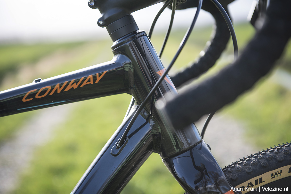 Met € 1.699,95 is de GRV 6.0 binnen het gravelbike-programma van Conway het op één na goedkoopste model. Z’n frame is gemaakt van drievoudig verjongde buizen van 6061 aluminium. Dat wil zeggen dat de wanddikte variabel is: dik waar het moet, dun waar het kan. Dat komt over het algemeen niet alleen het gewicht ten goede, maar ook het rijcomfort. Eerst maar even over dat gewicht: 10,85 kilo voor de complete fiets (zonder pedalen) is, ondanks dat triple butted-frame, niet echt licht. Hinderlijk? Ja en nee. Ja, want de GRV 6.0 mist hierdoor enigszins de dynamiek en levendigheid die lichtere gravelbikes wel kenmerken. Daar zijn overigens voornamelijk de wielen debet aan. Met 1,91 kg voor het voorwiel en 2,42 kg voor het achterwiel is de roterende massa, ondanks de relatief lichte Terra Speed-banden van Continental, niet bepaald gering. Aan de andere kant: als je eenmaal op gang bent is die extra massa niet zo bezwaarlijk en merk je vooral dat die luxe Conti-bandjes héél erg licht rollen. En door deze tubeless te maken valt nog flink wat gewicht te besparen.