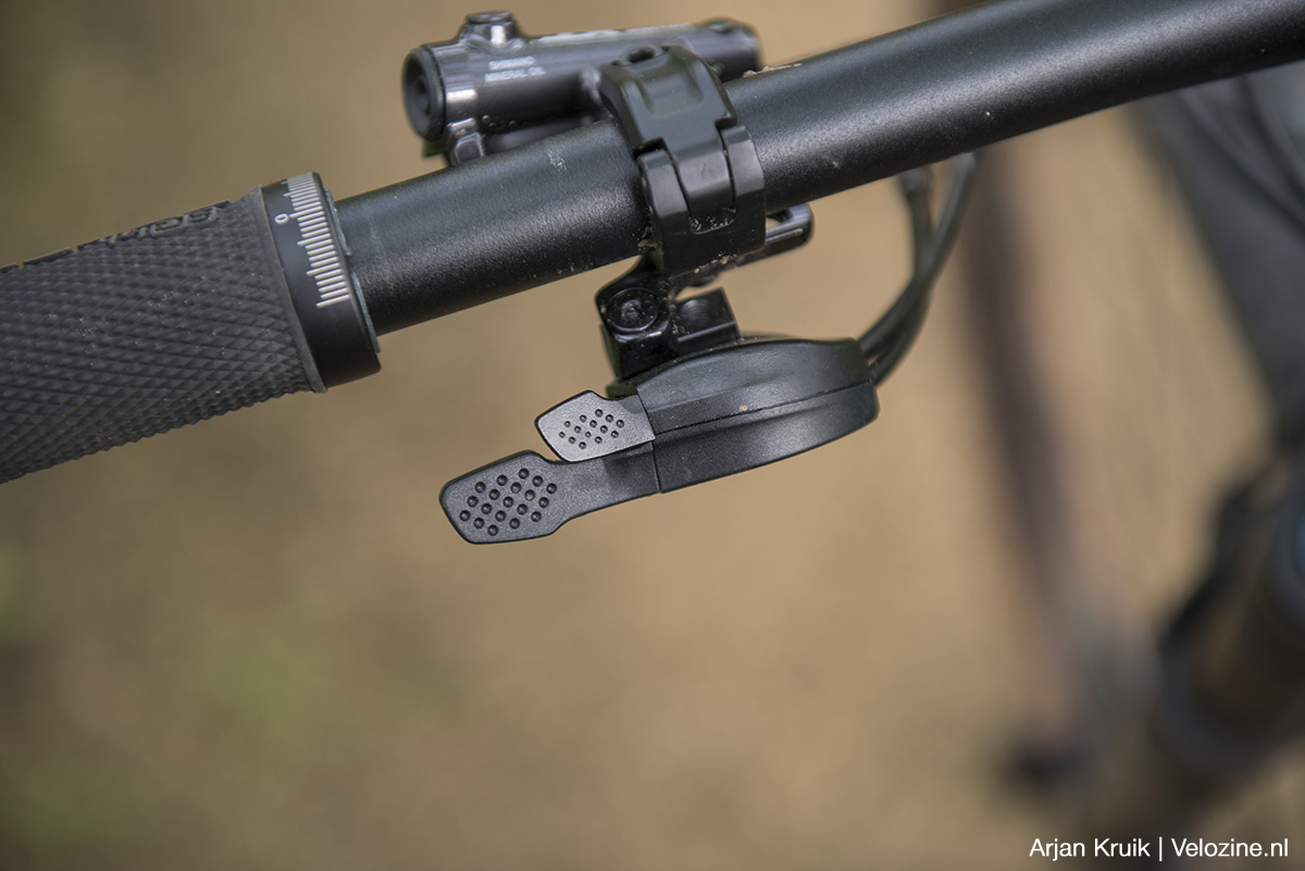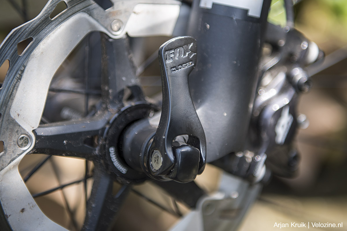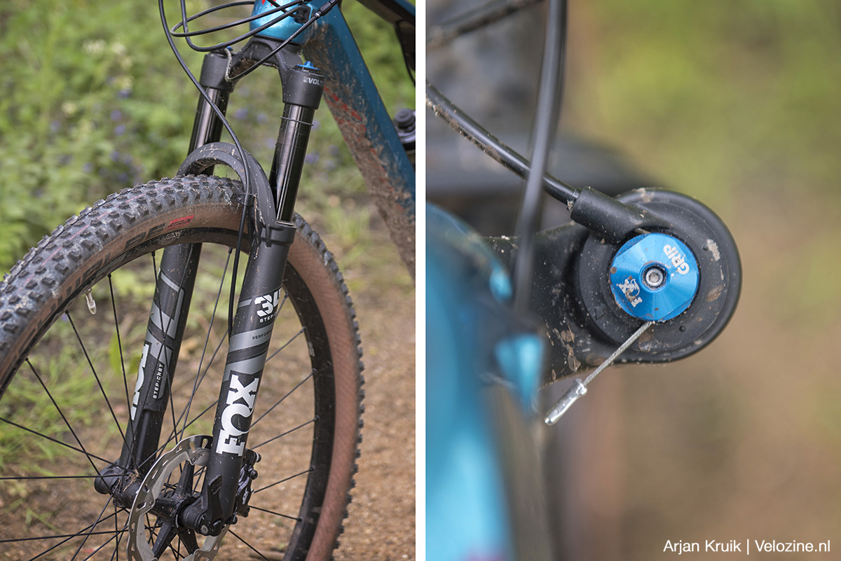 Naast veersysteem spelen uiteraard de veerelementen eveneens een rol. Voorin hangt een Fox 34 Step-Cast Performance, aan de achterkant vangt een Fox Float de klappen op. Naast luchtdruk en de demping van de uitgaande slag kun je bij de vork en de demper met behulp van een hendel onder het stuur kiezen tussen de standen ‘open’ en ‘gesloten’. Er is dus géén tussenliggende klimstand. Vind ik dat op sommige fullies een gemis, bij deze Conway maal ik er niet om. De achtervering is in de open stand namelijk nauwelijks gevoelig voor deinen. Inzakken van de achtervering in de steilste secties? Ook nauwelijks. Om die reden gebruik ik de blokkeerfunctie eigenlijk alleen maar op verbindingssecties over asfalt. En niet eens omdat het echt nodig is, maar omdat het kan.
