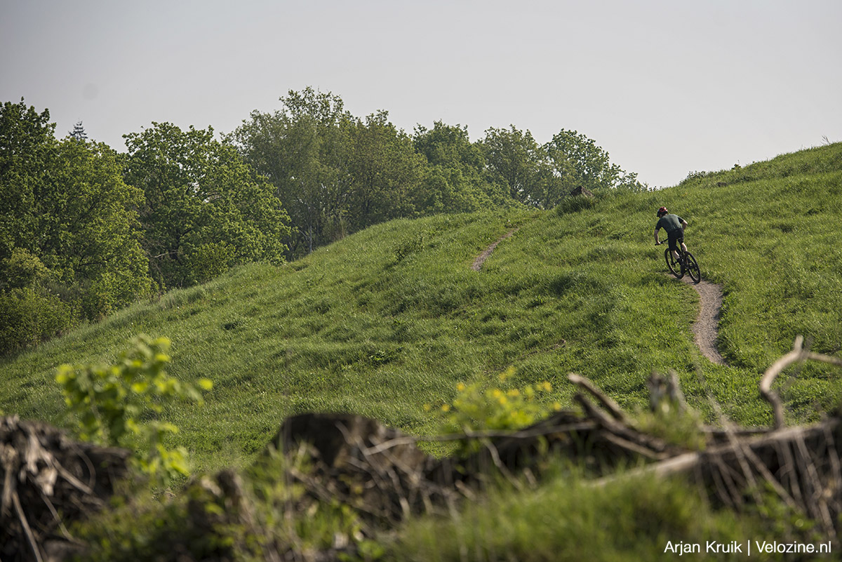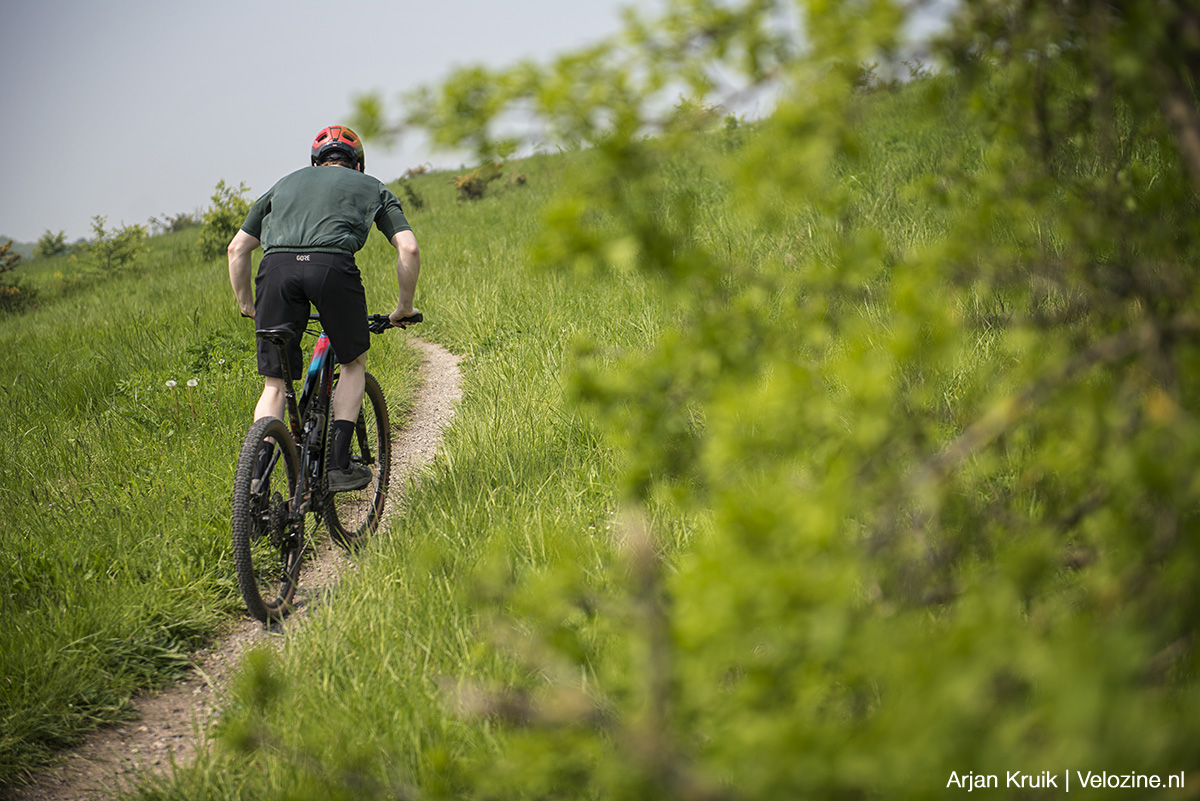 Op die manier afgesteld klimt deze dubbelgeveerde Duitser echt fantastisch, met name als je op het zadel blijft zitten. Het voorwiel blijft de ondergrond goed volgen en de achterkant grossiert in grip. Op Col du Kragge, de route op de voormalige vuilnisbelt De Kragge bij Bergen op Zoom, is dat een enorm pluspunt. De beklimmingen zijn daar namelijk steil tot zeer steil, terwijl de ondergrond bestaat uit fijn grind. Niet bepaald een combinatie die garant staat voor veel tractie, maar de Conway heeft er maar weinig moeite mee.
